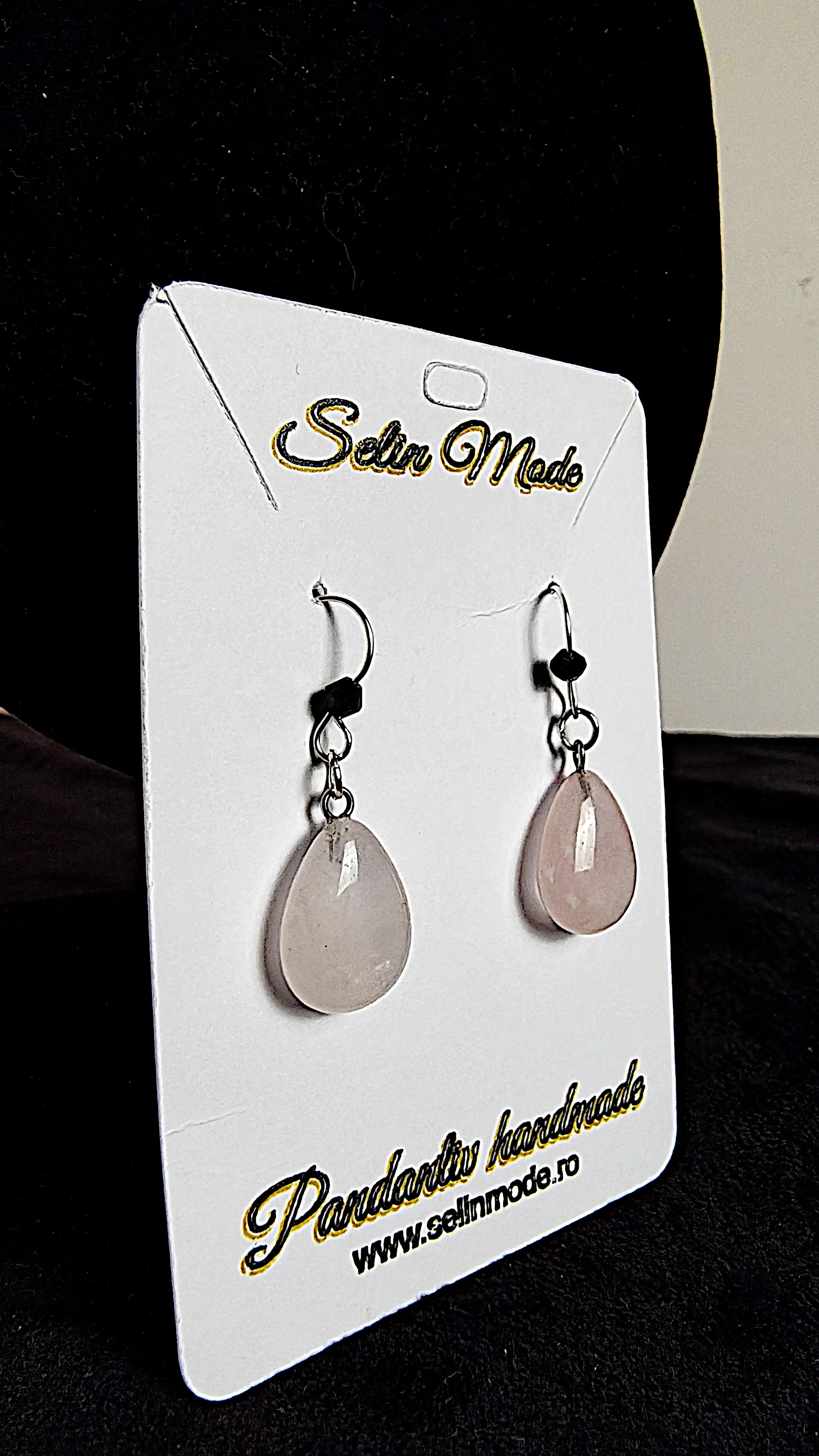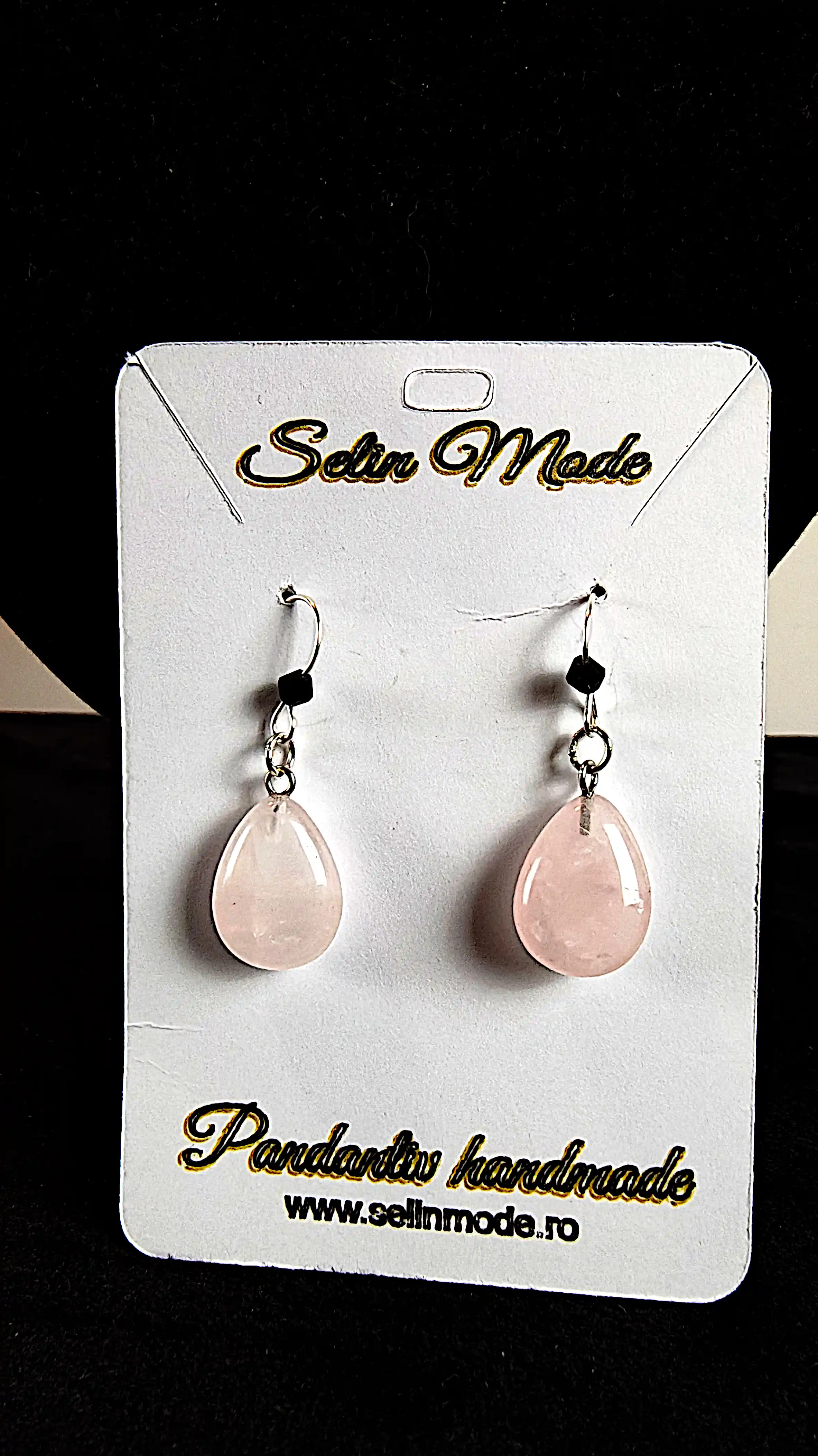 Set de cercei eleganți, realizați manual din piatră naturală de cuarț roz, șlefuită fin în formă de lacrimă, completată cu o mică bilă decorativă neagră pentru contrast. Cuarțul roz, cunoscut drept piatra iubirii și a armoniei, este apreciat pentru nuanța sa delicată și translucența rafinată.