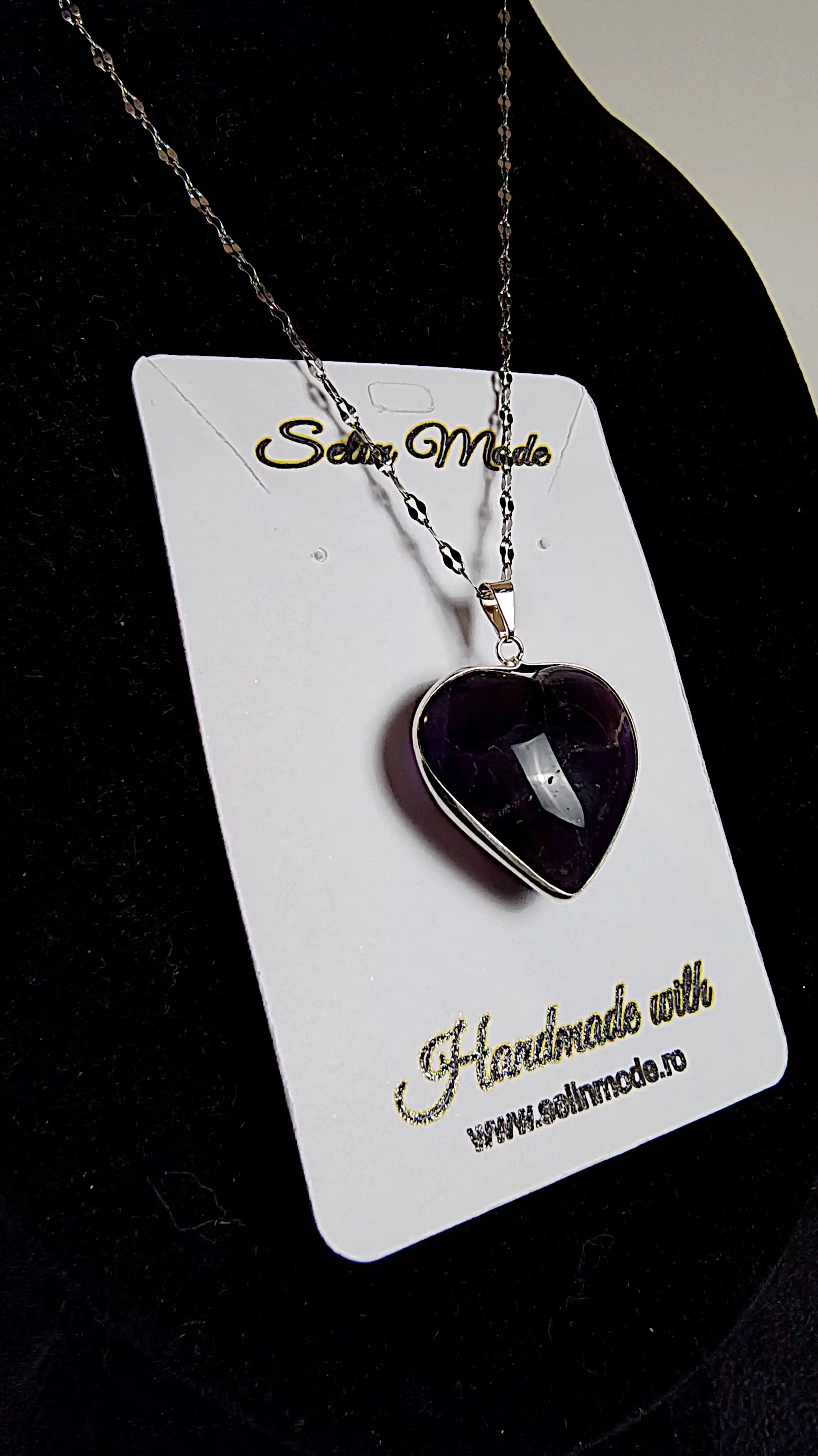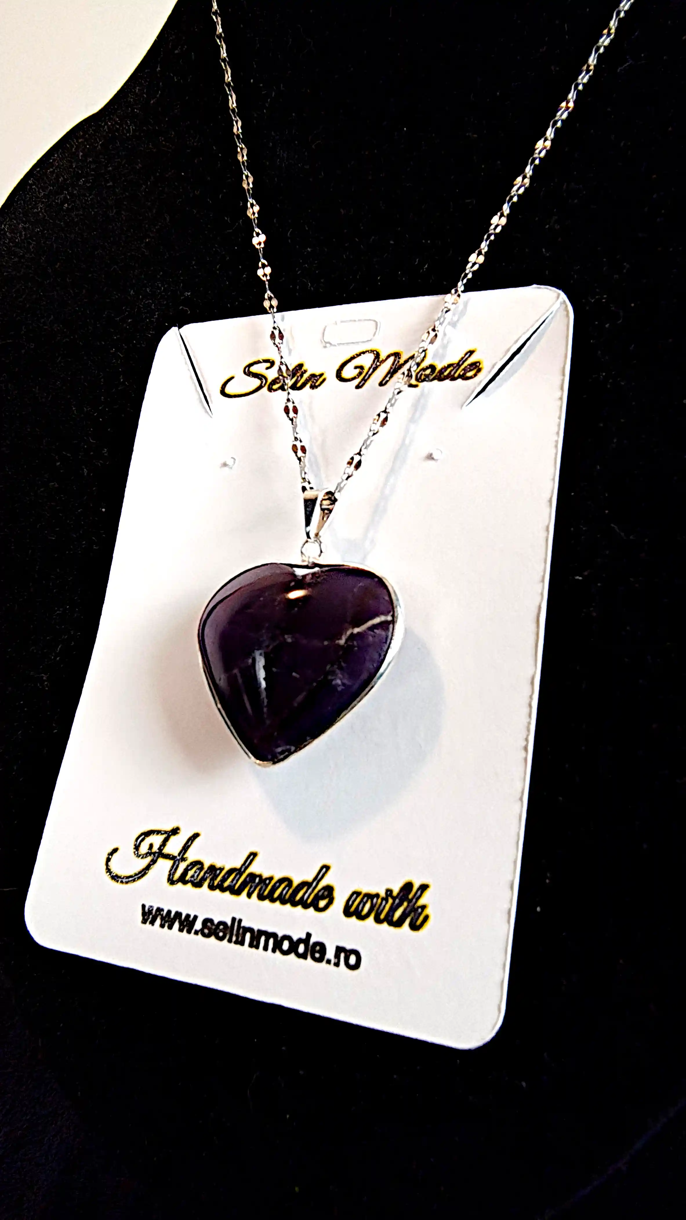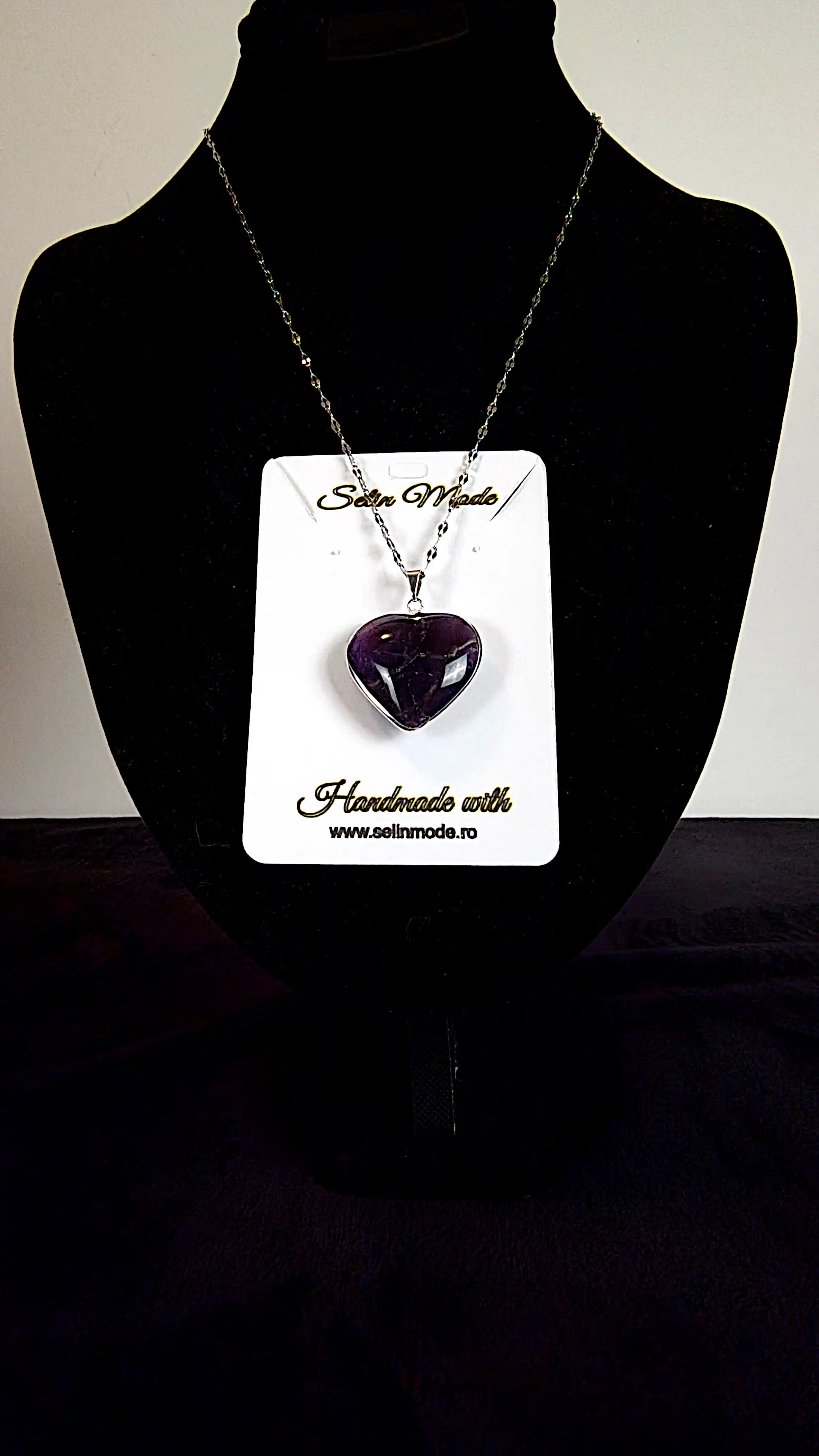 Pandantiv inimă din piatră naturală Ametist, simbol al calmului și al echilibrului interior. Bijuterie handmade Selin Mode, realizată cu finețe și atenție la detalii.