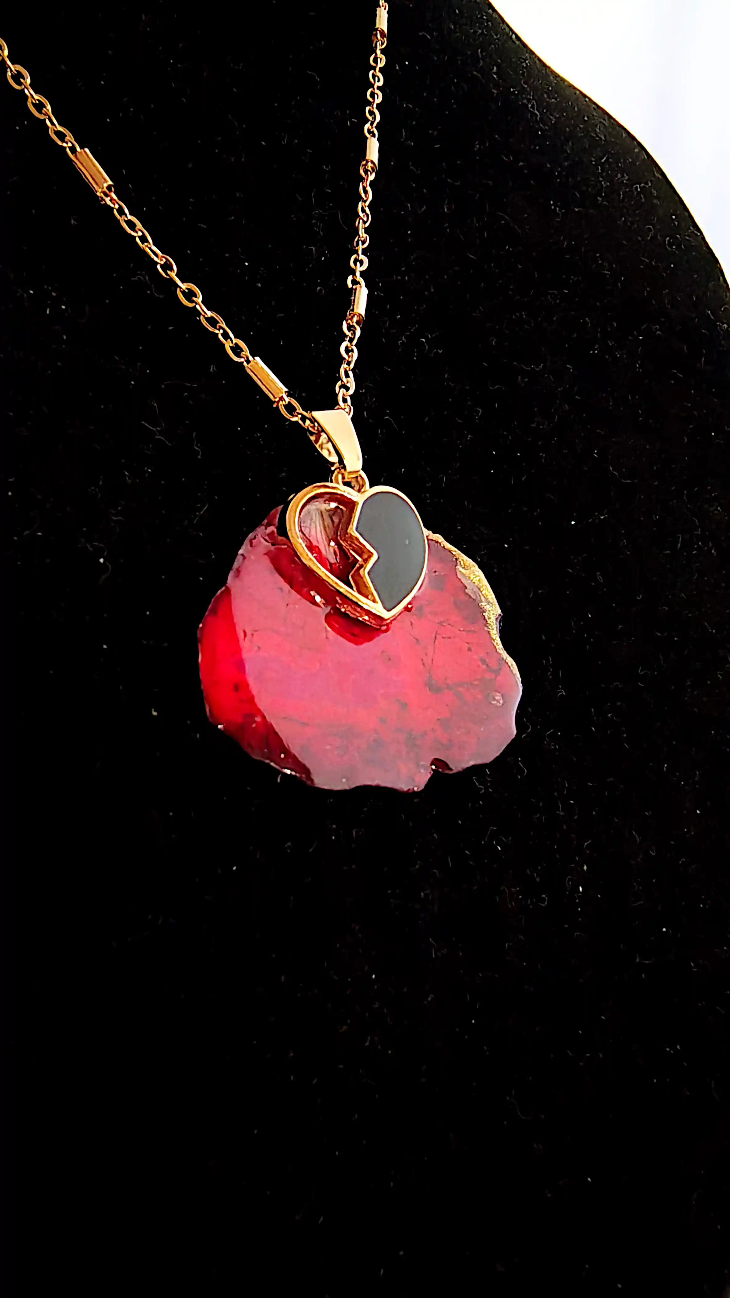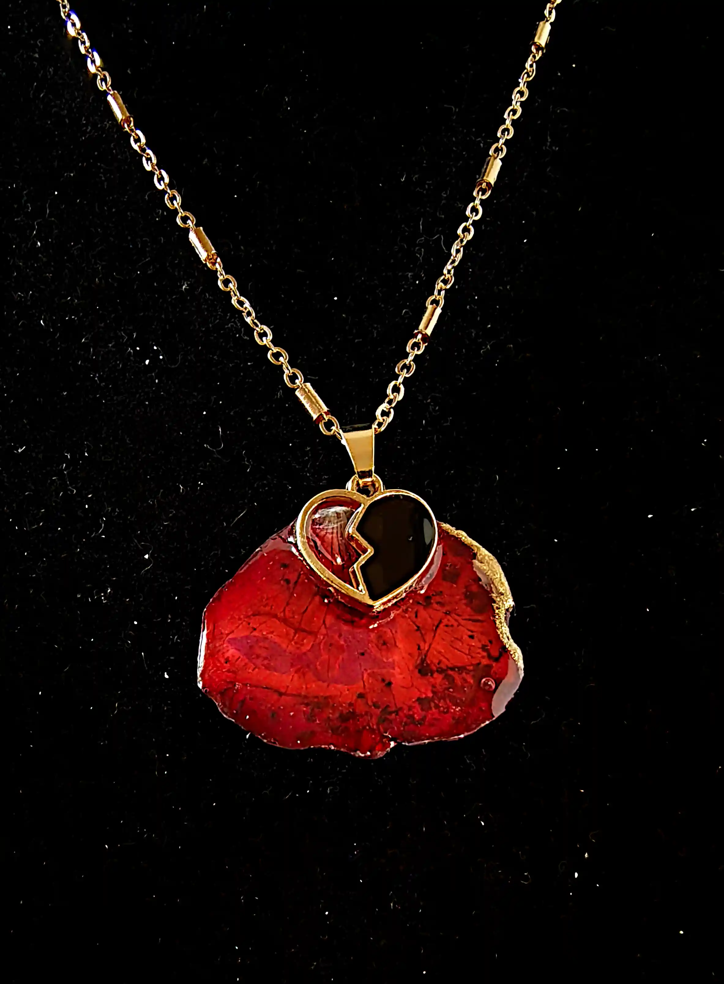 Pandantivul SM 83 este realizat manual din petală naturală de trandafir, uscată și stabilizată, ulterior protejată prin strat de rășină epoxidică pentru a-i păstra culoarea și textura în timp. Petala autentică este colorată natural în nuanțe intense de roșu, iar deasupra este montat un element decorativ metalic în formă de inimă, cu design ruptură (half broken heart), ce adaugă un stil simbolic și modern.