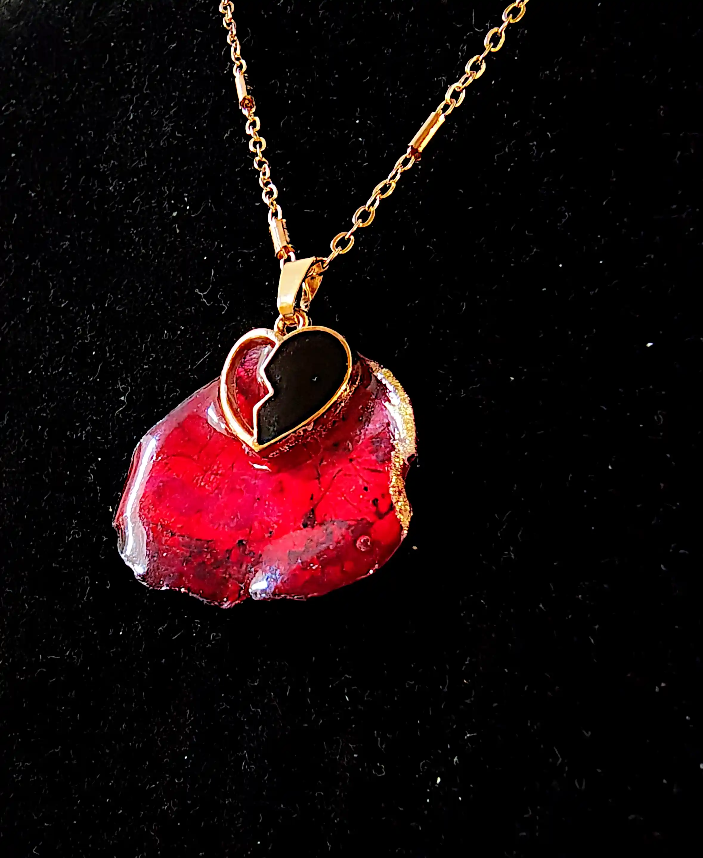 Pandantiv handmade din petală naturală de trandafir, în rășină, cu decor inimă metalică.