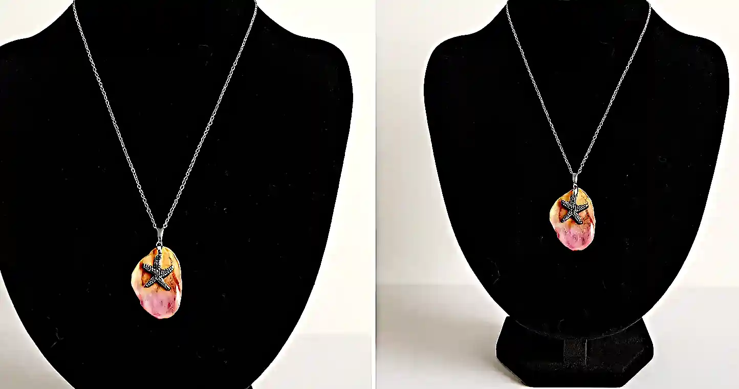 Designul este completat de un detaliu decorativ elegant în formă de stea de mare, aplicat pe suprafața petalei, simbol al echilibrului și armoniei. Nuanțele petalei se împletesc subtil – de la roz pal la accente aurii – conferind bijuteriei o notă rafinată și naturală.