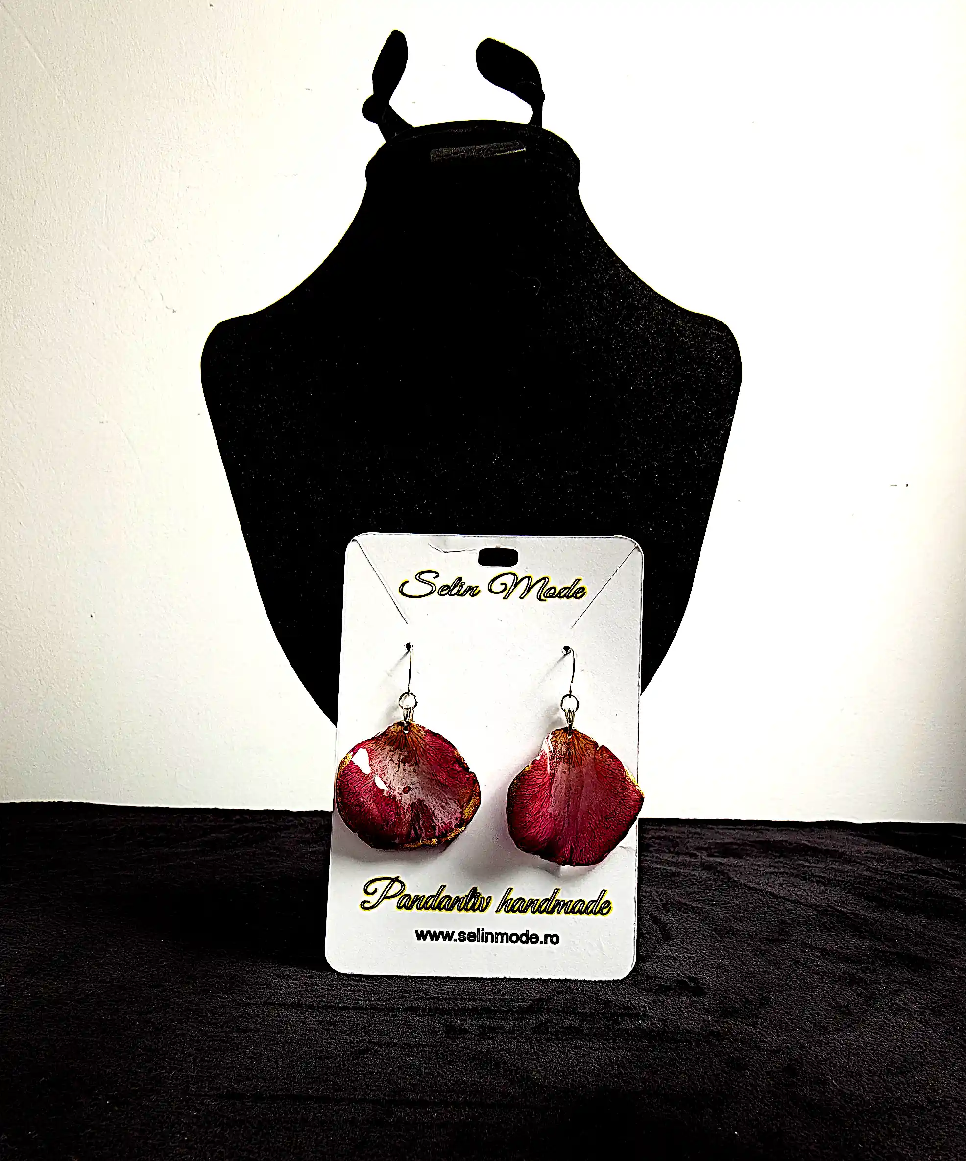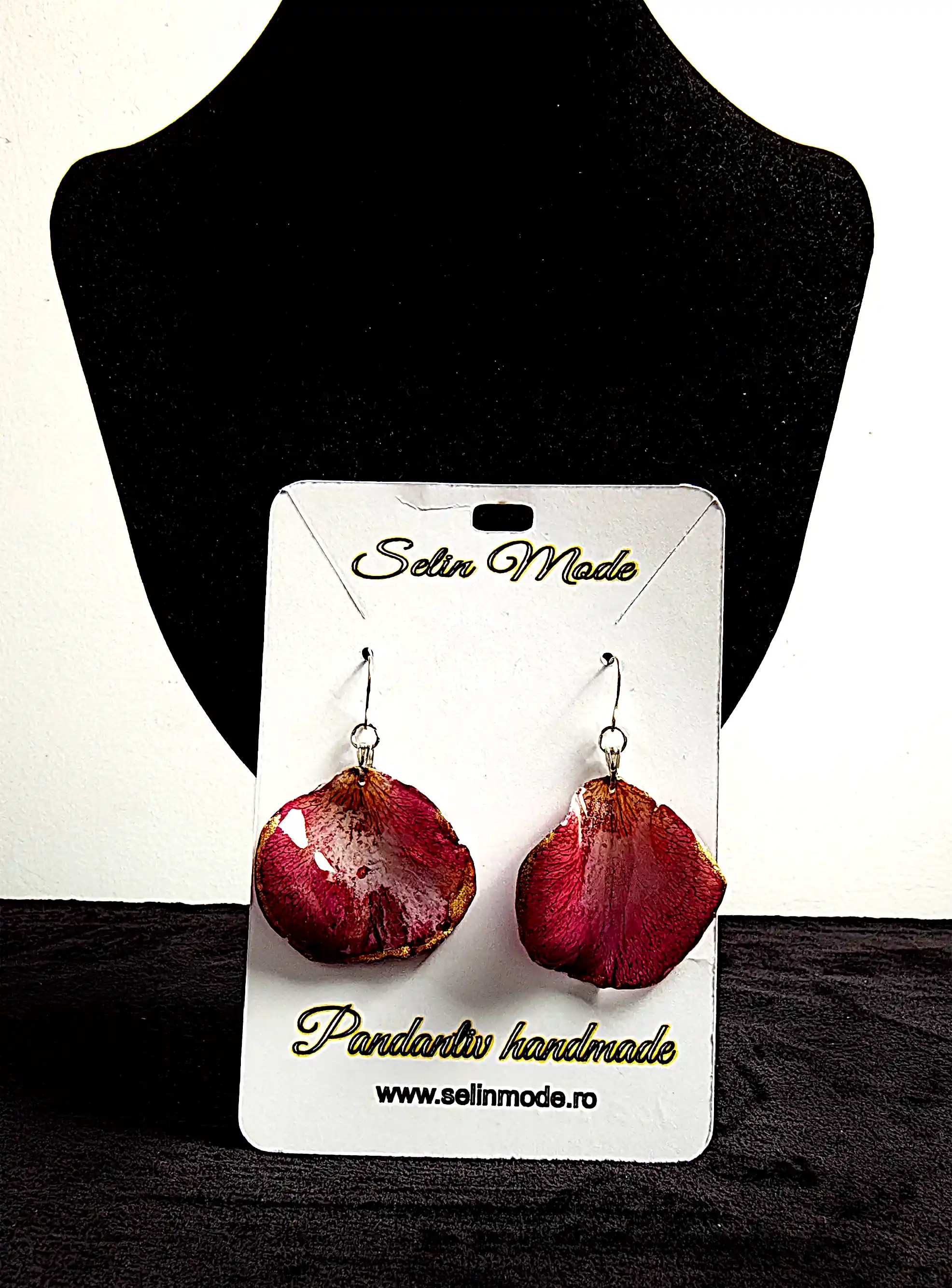 Cercei handmade unicat din petale naturale de trandafir, conservați în rășină transparentă cu accente aurii. Nuanțele calde de roșu și finisajele lucioase oferă o eleganță naturală. Tortițele din cupru argintat completează designul rafinat. Fiecare pereche este unică, realizată manual în România, parte din colecția “Eleganță naturală” Selin Mode.