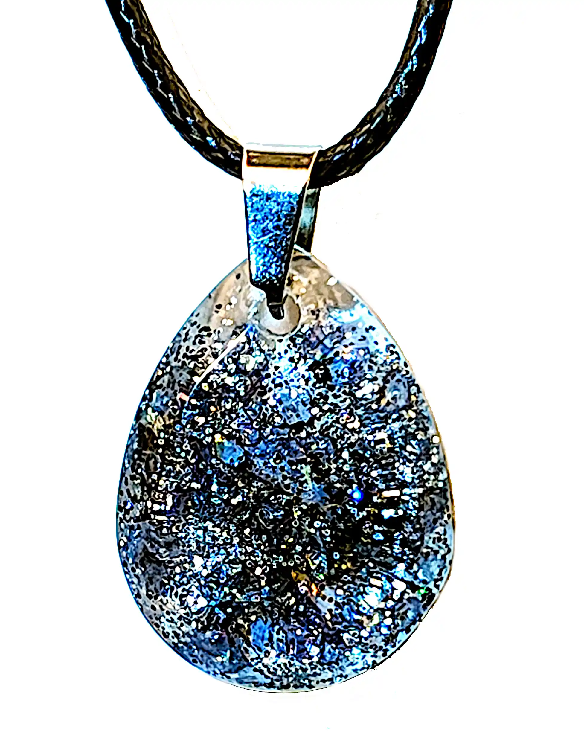 Pandantiv în formă de picătură din rășină albastră cu sclipici iridescent și efect holografic, pe șnur negru ajustabil cu închidere argintie. Model SM 213 - bijuterie handmade unică de la Selin Mode.