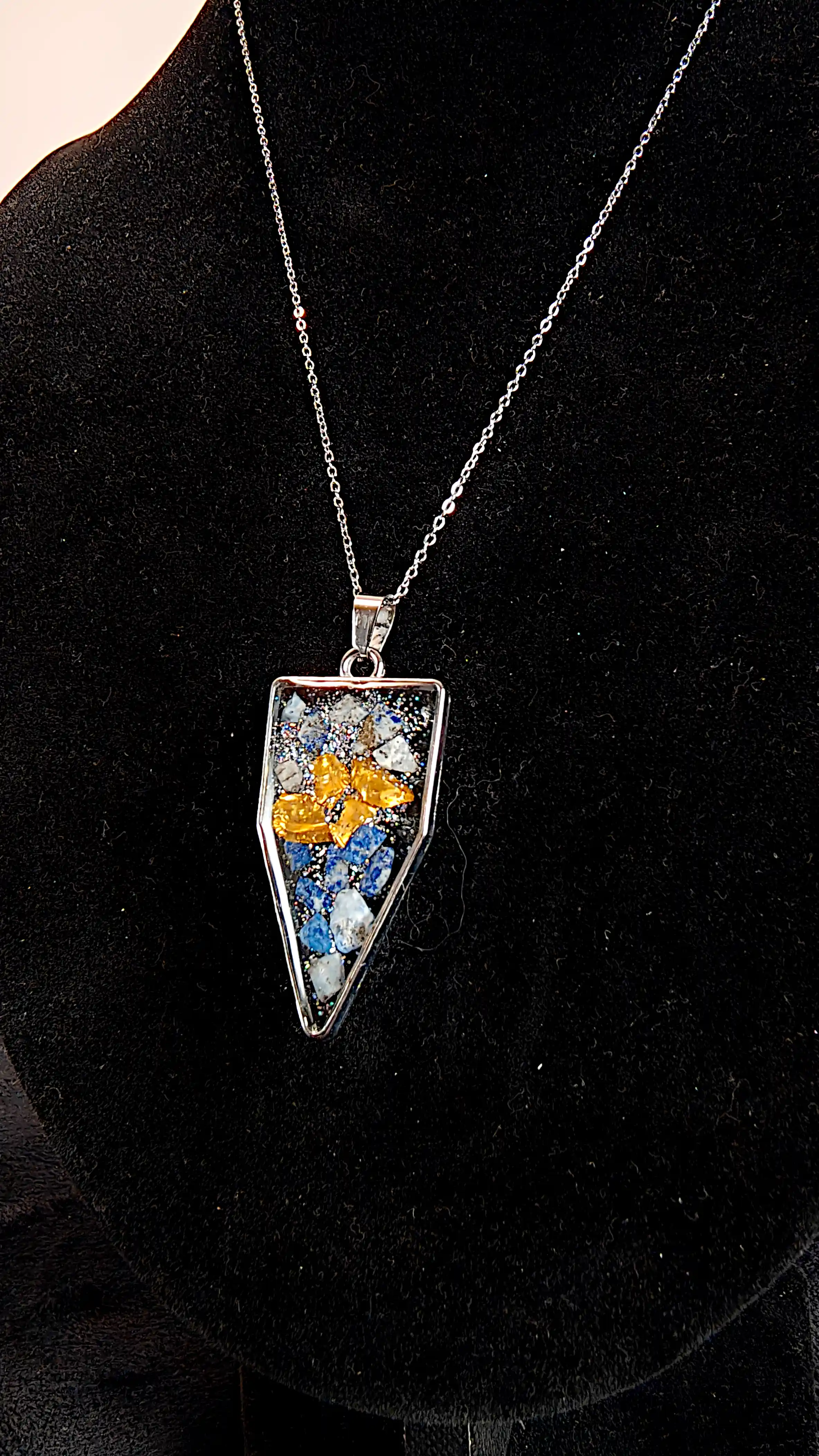 Pandantivul SM 65 este o bijuterie handmade cu un design modern, realizat într-o formă geometrică ascuțită, elegant conturată cu metal argintiu. Interiorul este lucrat manual în rășină transparentă și include o combinație decorativă de elemente inspirate de lapis lazuli, tonuri albastre intense, fragmente deschise la culoare și un accent central galben, care adaugă contrast și profunzime vizuală.
