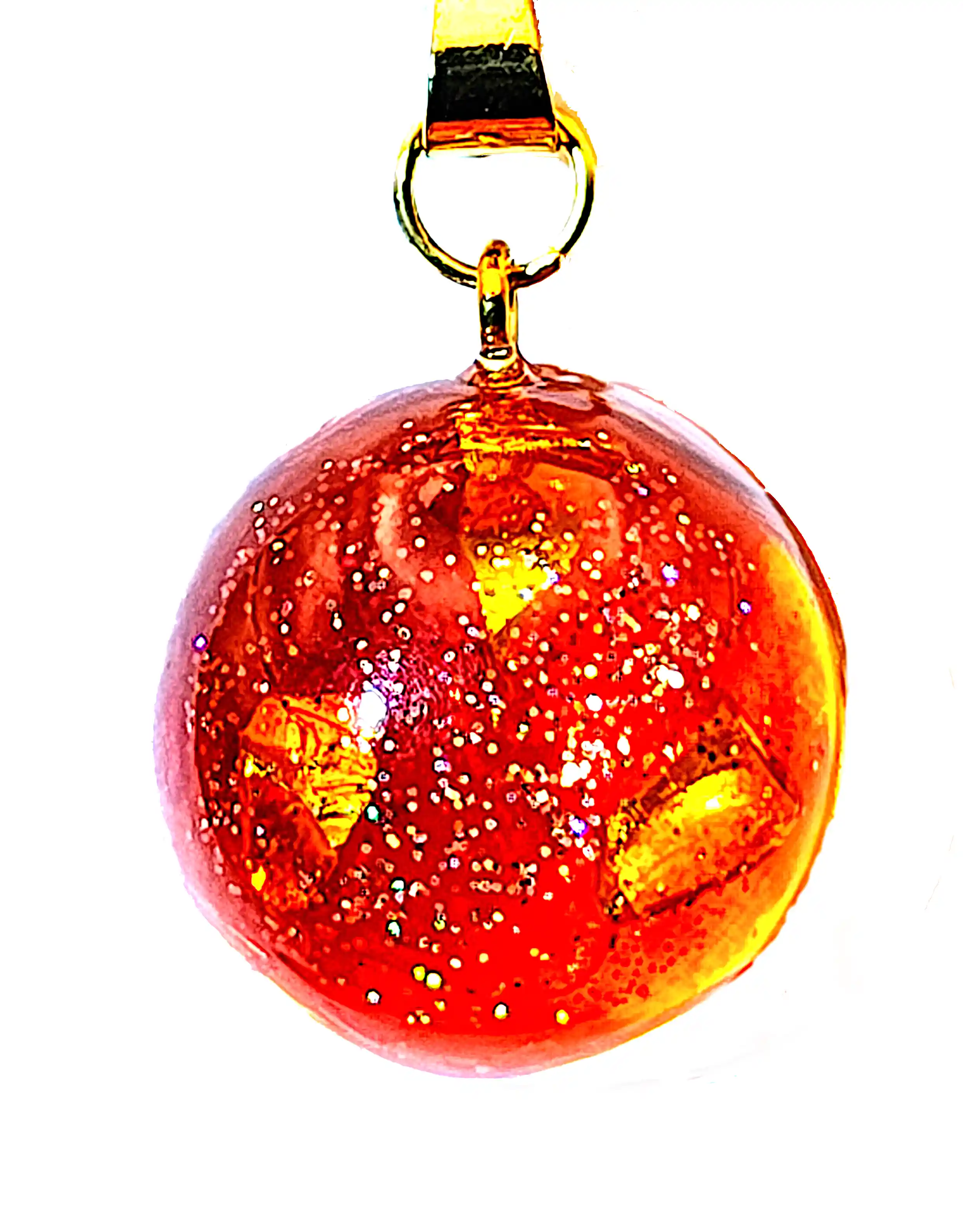 Pandantiv sferic din rășină roșie cu fulgi galbeni și sclipici strălucitor, cu atașament auriu. Model SM 210 - bijuterie handmade vibrantă de la Selin Mode.