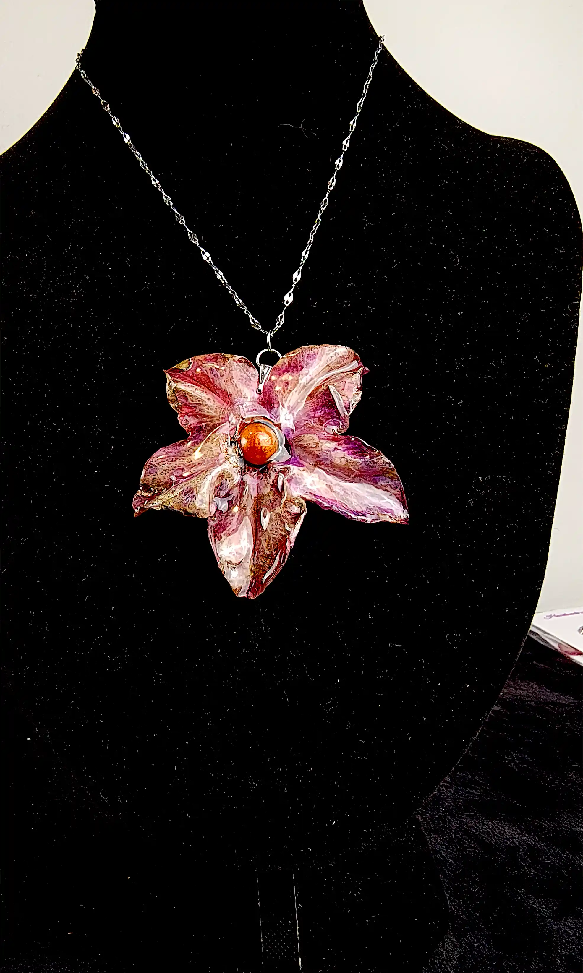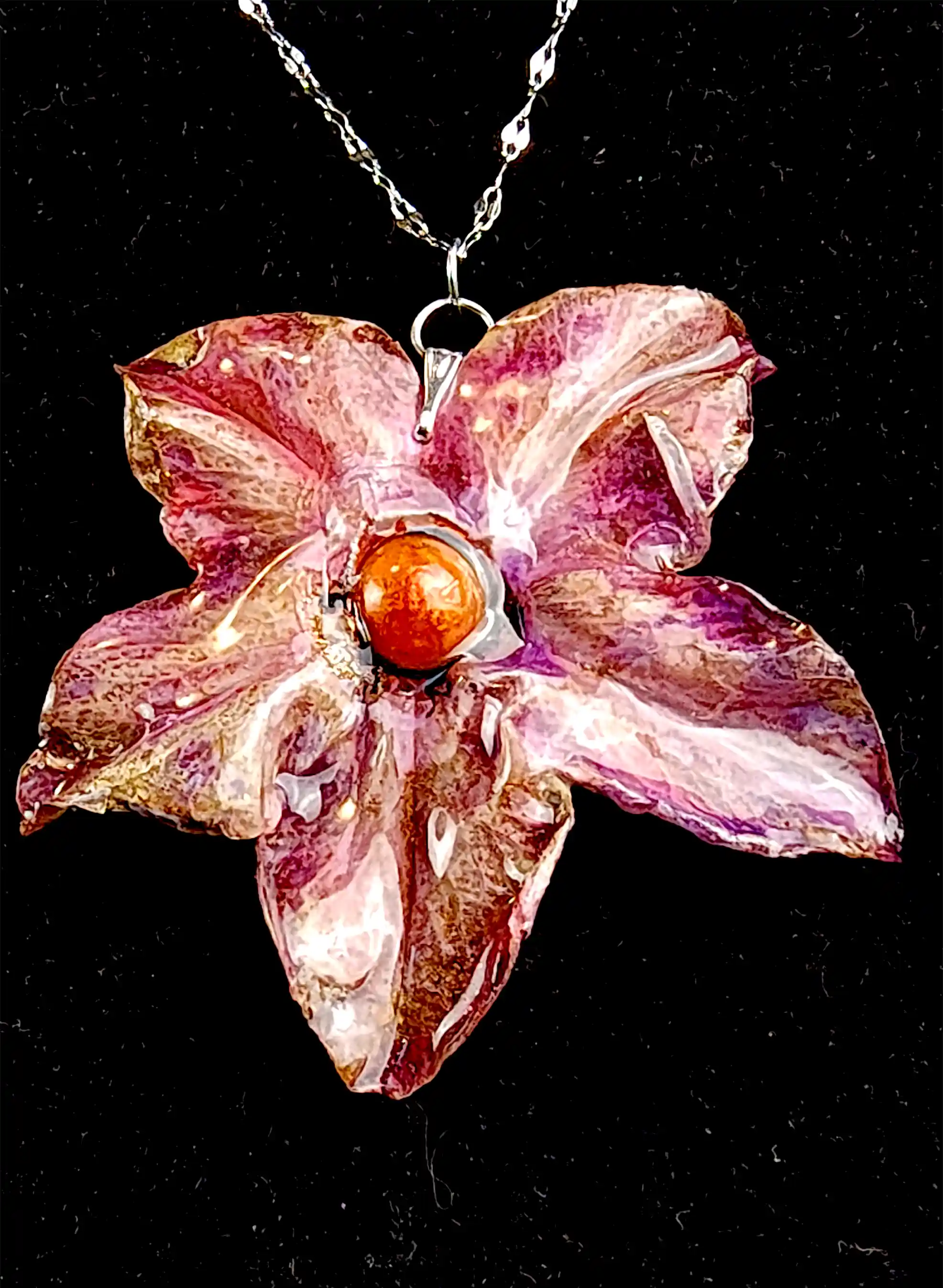 În centrul florii este integrată o perlă decorativă de culoare portocalie, care adaugă profunzime și un accent elegant, scoțând în evidență nuanțele vii de roz, violet și auriu ale petalelor naturale.