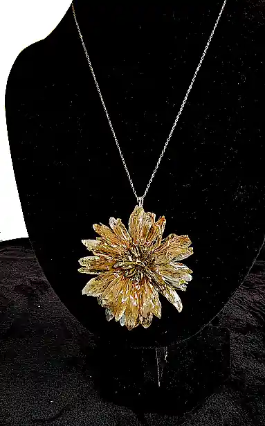 Crizantema este considerată floarea longevității și a armoniei, iar aspectul său bogat și simetric oferă pandantivului o prezență sofisticată, perfectă pentru femeile care apreciază frumusețea naturală transpusă în artă purtabilă.