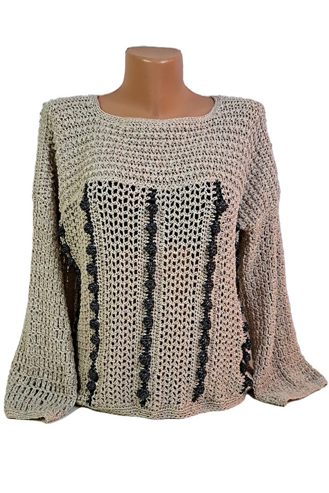 Partea frontală prezintă un joc vizual interesant de ochiuri mari și mici, evidențiate de dungi verticale din puncte texturate, care oferă structură și efect estetic suplimentar. Mânecele sunt realizate într-un model croșetat mai dens, conferind stabilitate zonei brațelor și o uniformitate plăcută.