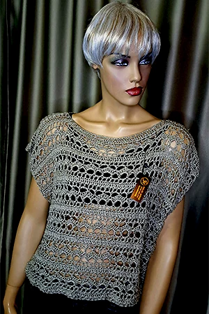 Această bluză croșetată manual SM 15 B este realizată într-un model aerat, cu motive decorative repetate, lucrate cu atenție pentru a oferi o textură ușoară și elegantă. Observația imaginii arată o croială lejeră, cu mâneci scurte căzute și un guler rotund, confortabil. Nuanța predominantă este gri natural, ușor neutră, ceea ce face ca bluza să fie ușor de asortat în ținute casual sau elegante de vară.