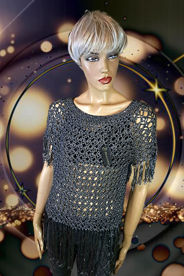 Bluză croșetată manual SM 16 B, realizată cu un model aerisit, de tip plasă decorativă, lucrată uniform și finisată cu franjuri lungi atât în partea de jos, cât și la mâneci. Textura este lejeră, conferind o transparență elegantă și un aspect modern, potrivit pentru ținute de vară, plajă sau ținute casual-layering.