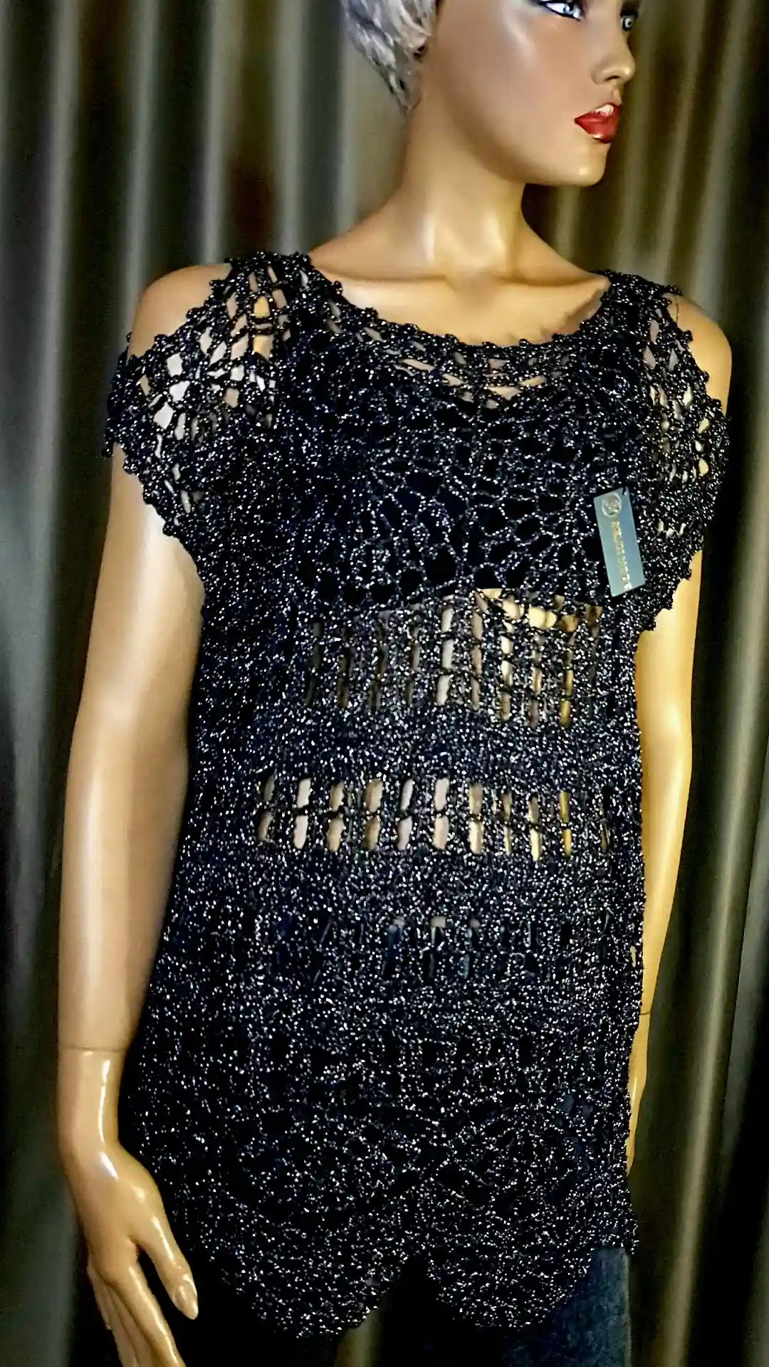 Bluză croșetată manual SM 17 B, cu model floral și design aerisit, realizată cu fir lucios. Croială lejeră și margine decorativă, ideală pentru layering și ținute elegante handmade.