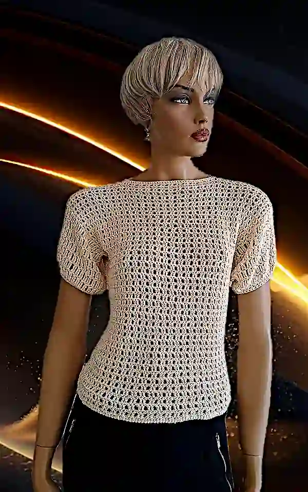 Bluză croșetată manual SM 28 B, realizată într-un model aerat, format din ochiuri uniforme dispuse geometric pe întreaga suprafață. Croiala este dreaptă, bine conturată, cu mâneci scurte și ușor bufante, lucrate într-un mod care adaugă volum și un efect elegant. Gulerul rotund este simplu și bine definit.