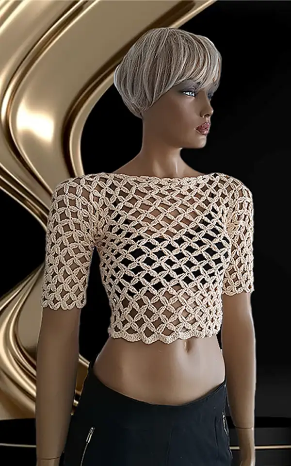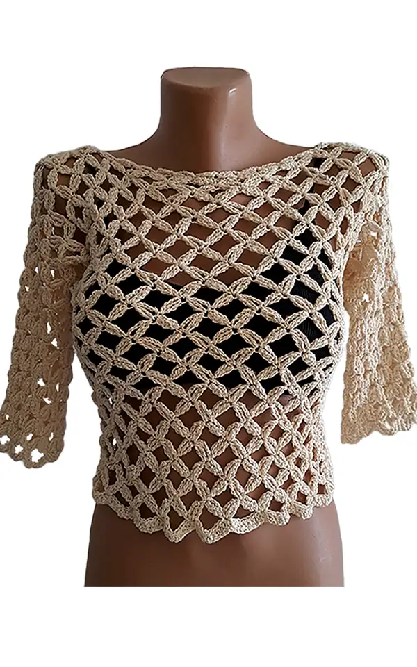Croiala este scurtă, lejeră, cu mâneci trei sferturi și guler rotund larg. Nuanța vizibilă este un bej deschis, natural, ușor de asortat cu orice stil. Bluza este complet transparentă datorită lucrăturii aerate și necesită purtare cu un top, bustieră sau costum de baie, în funcție de context.
