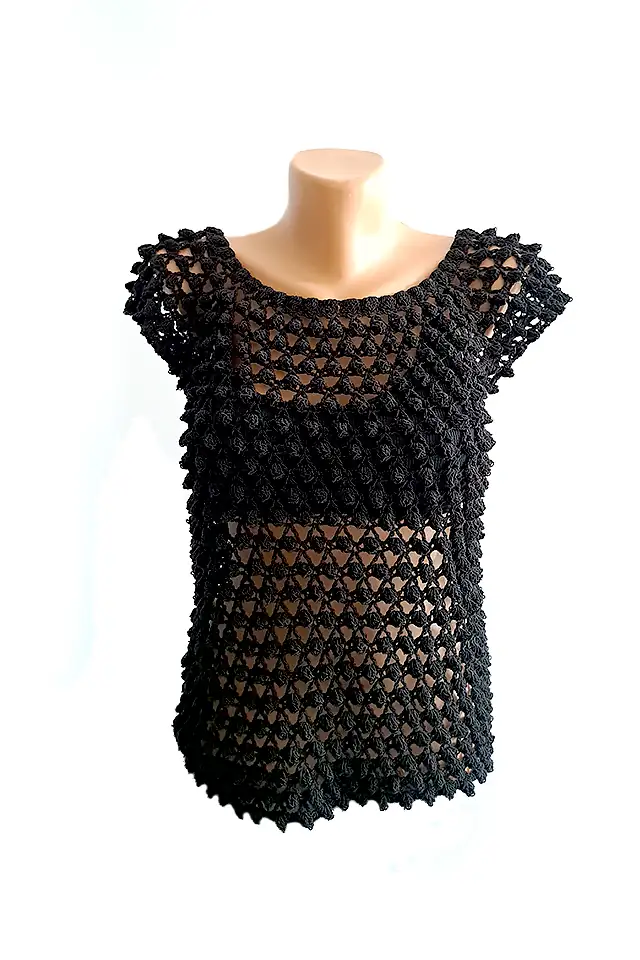 Bluză croșetată manual SM 38 B, realizată într-un model complex cu ochiuri 3D reliefate, dispuse în formă de plasă pe întreaga suprafață. Textura este vizibil voluminoasă, cu noduri mici care creează un efect tridimensional unic. Acest model conferă bluzei un aspect modern, elegant și foarte decorativ.