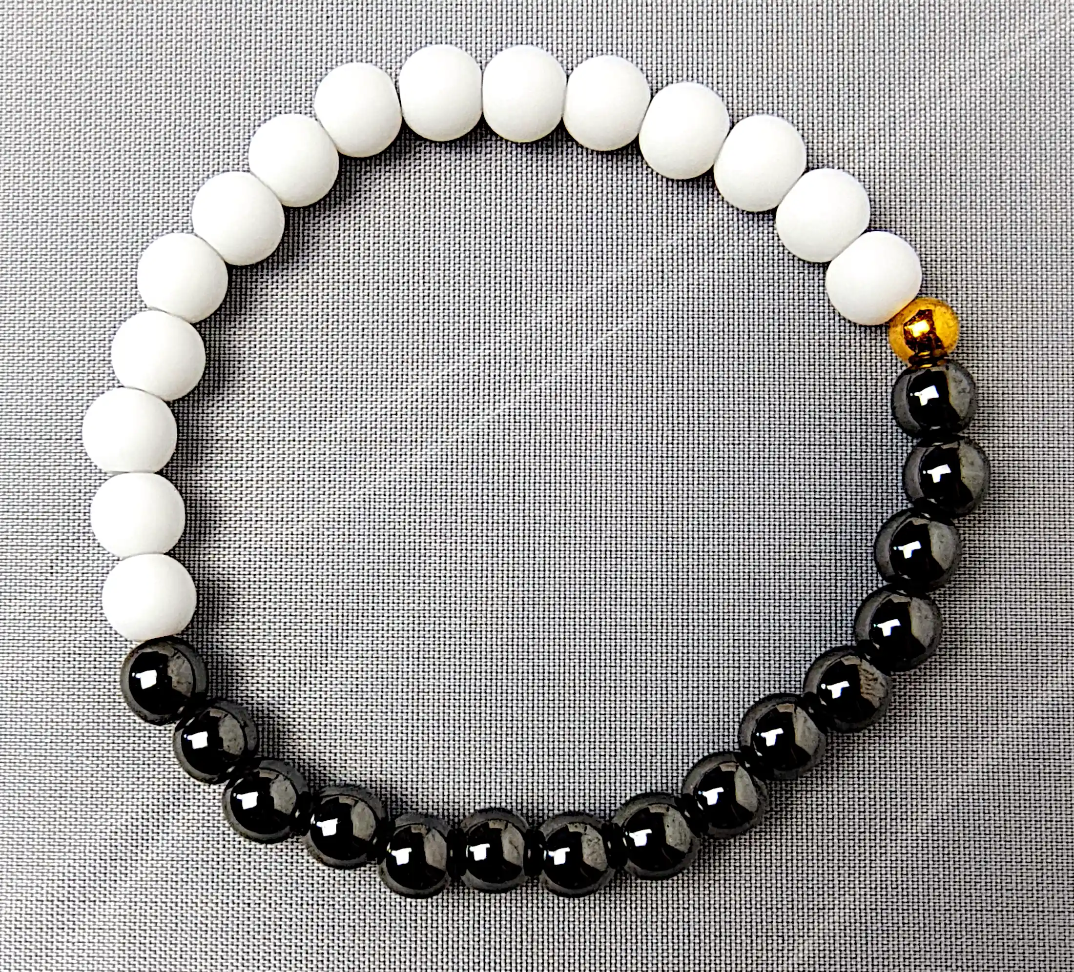 Brățară elastică realizată manual, formată din mărgele de 6 mm din onix alb (jumătate de brățară) și mărgele de 6 mm din hematit (jumătate de brățară) și o bilă metalică aurie, pe fir elastic rezistent.