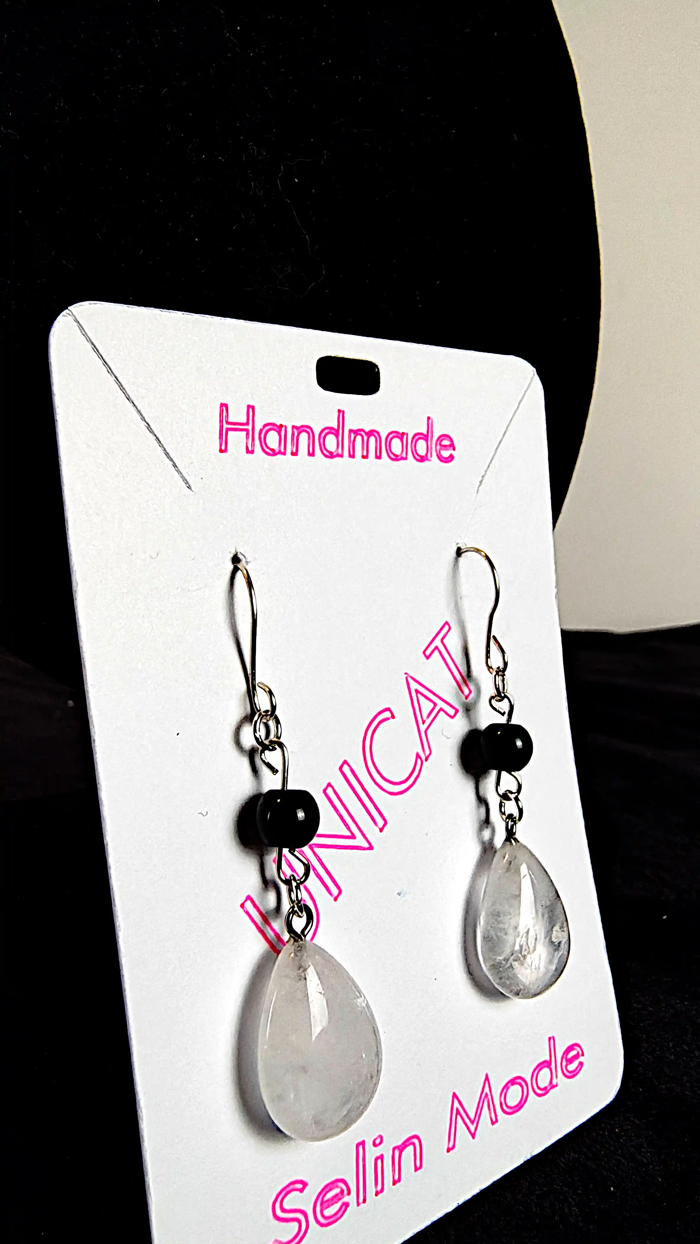 Set de cercei eleganți, realizați manual din piatră naturală de cuarț alb în formă de lacrimă, completată cu o bilă decorativă neagră. Cuarțul alb, cunoscut pentru claritatea și finețea sa naturală, aduce o notă de rafinament discret și echilibru vizual, în timp ce accentul negru oferă contrast și profunzime designului.