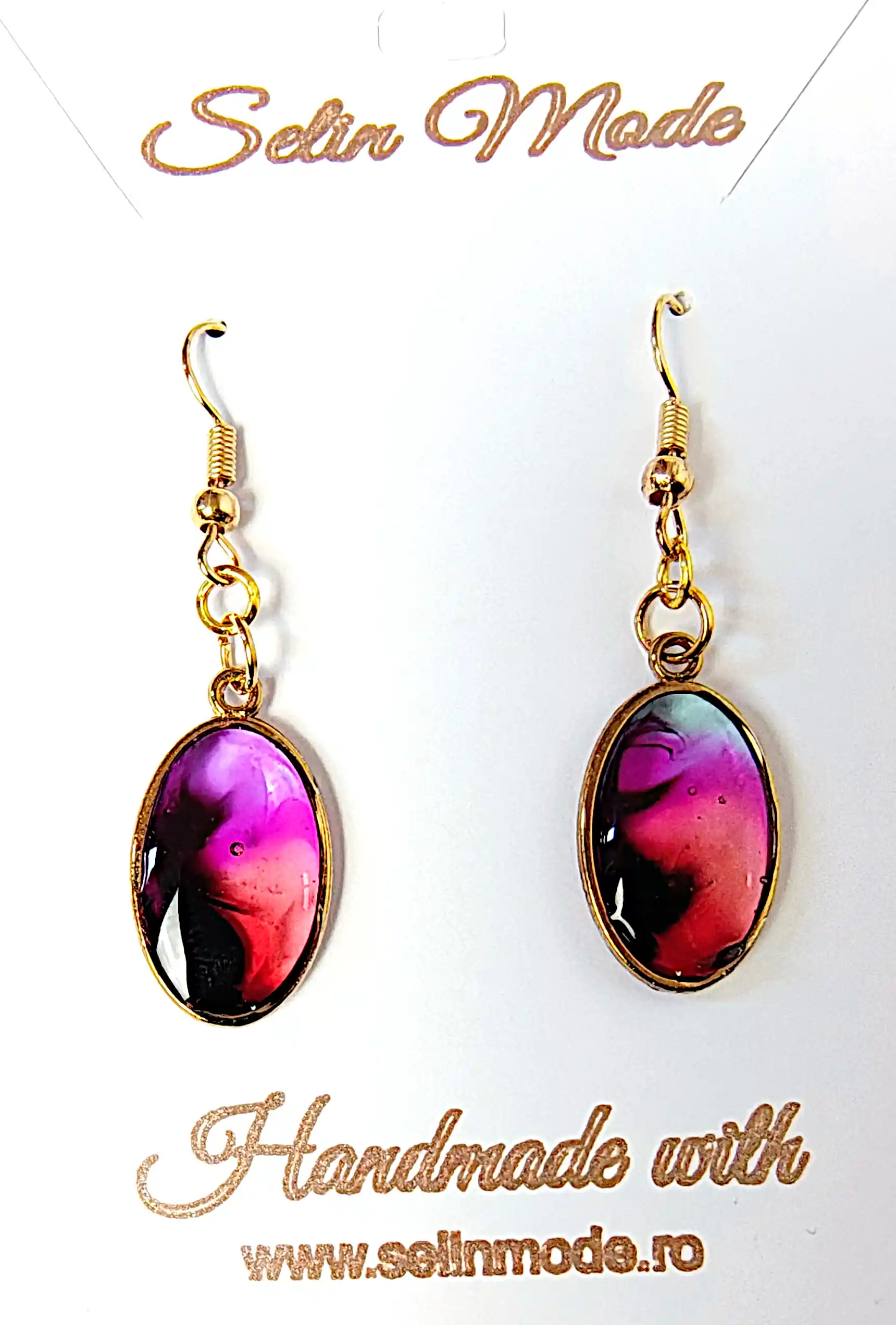 Cercei handmade din rășină în nuanțe mov-roz, în suport auriu. Model artistic fluid, unic. Cod SM165.