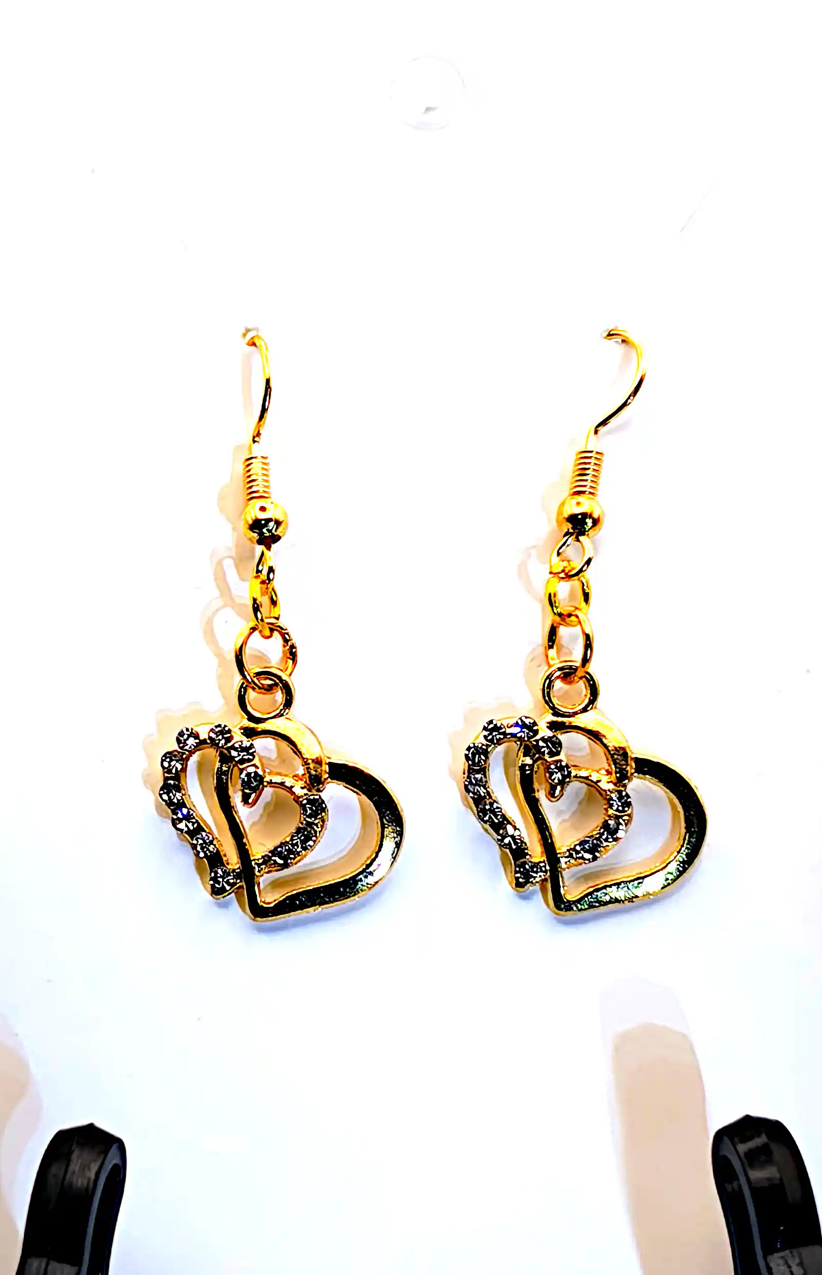 Prinderea este de tip cârlig, cu elemente metalice aurii, ușor de purtat și potrivite pentru uz zilnic. Forma curbată a inimilor și contrastul dintre liniile aurii și detaliile strălucitoare oferă pieselor un aspect romantic și feminin.