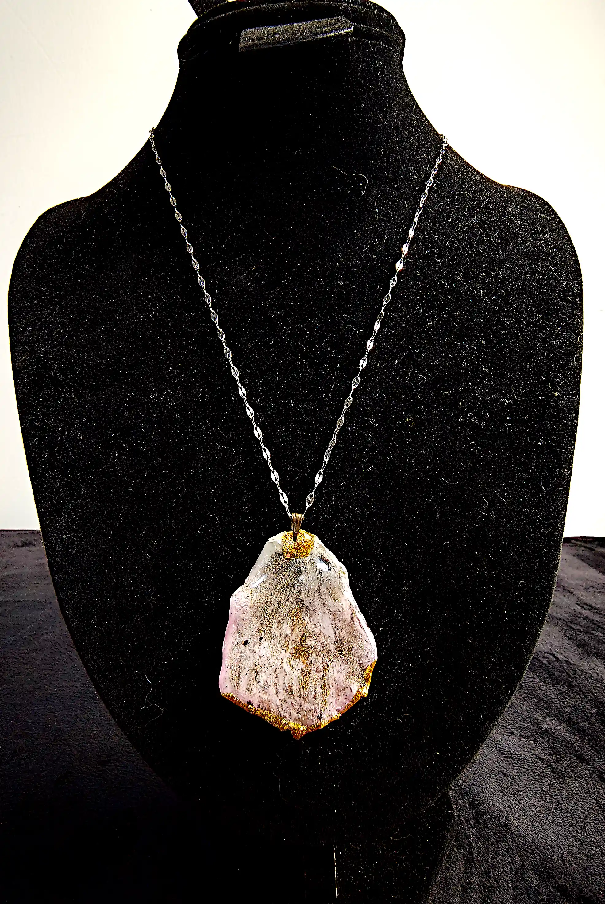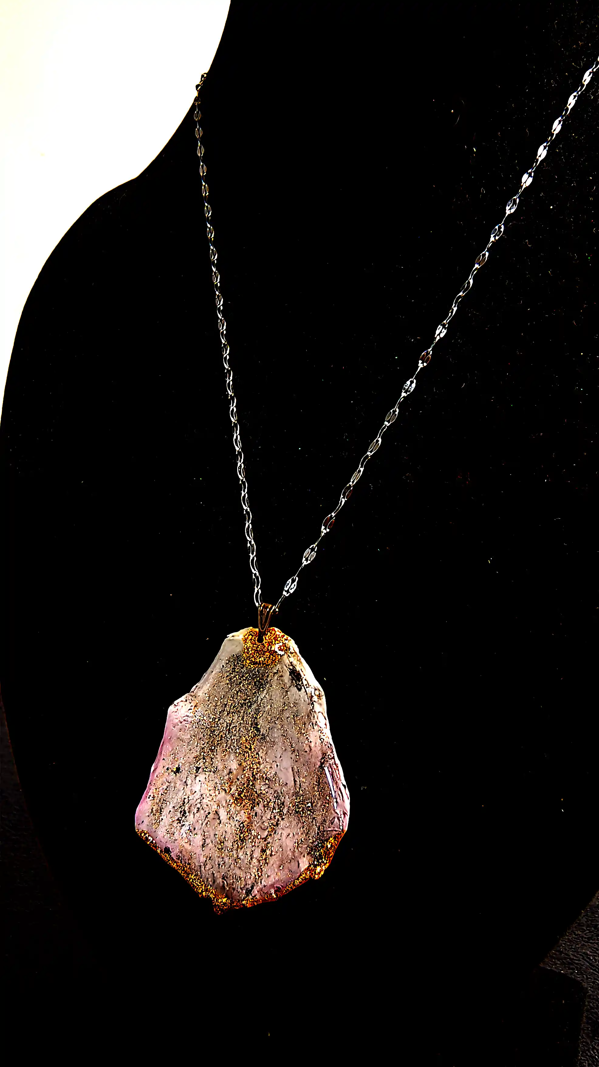 Pandantivul SM 44 este o creație handmade deosebită, realizată din petală naturală de trandafir, conservată manual și protejată cu grijă într-un strat de rășină epoxidică transparentă. Procesul de turnare și finisare evidențiază textura naturală a petalei și frumusețea unică a nuanțelor sale.
