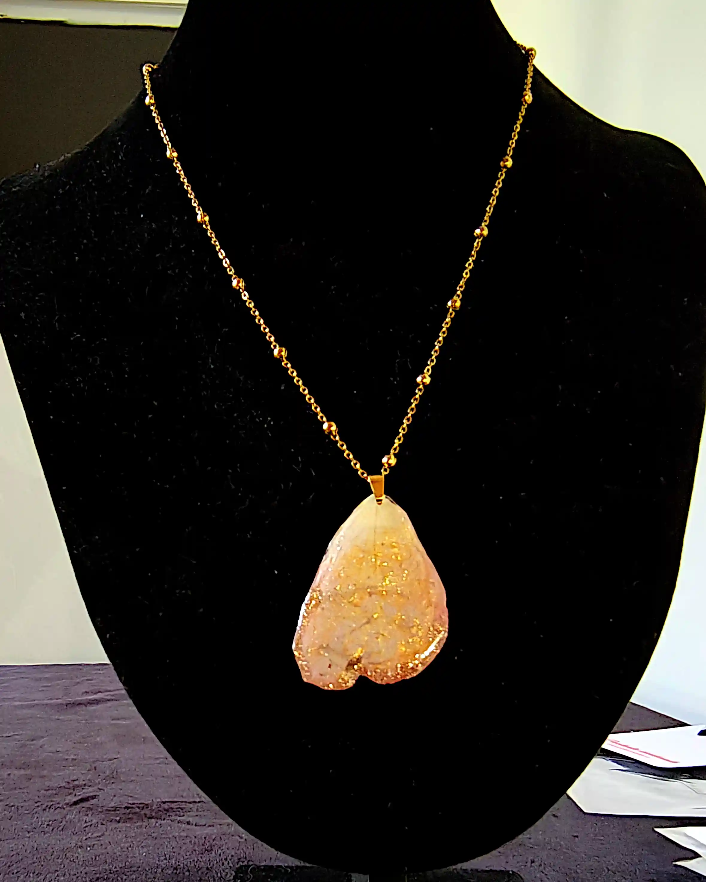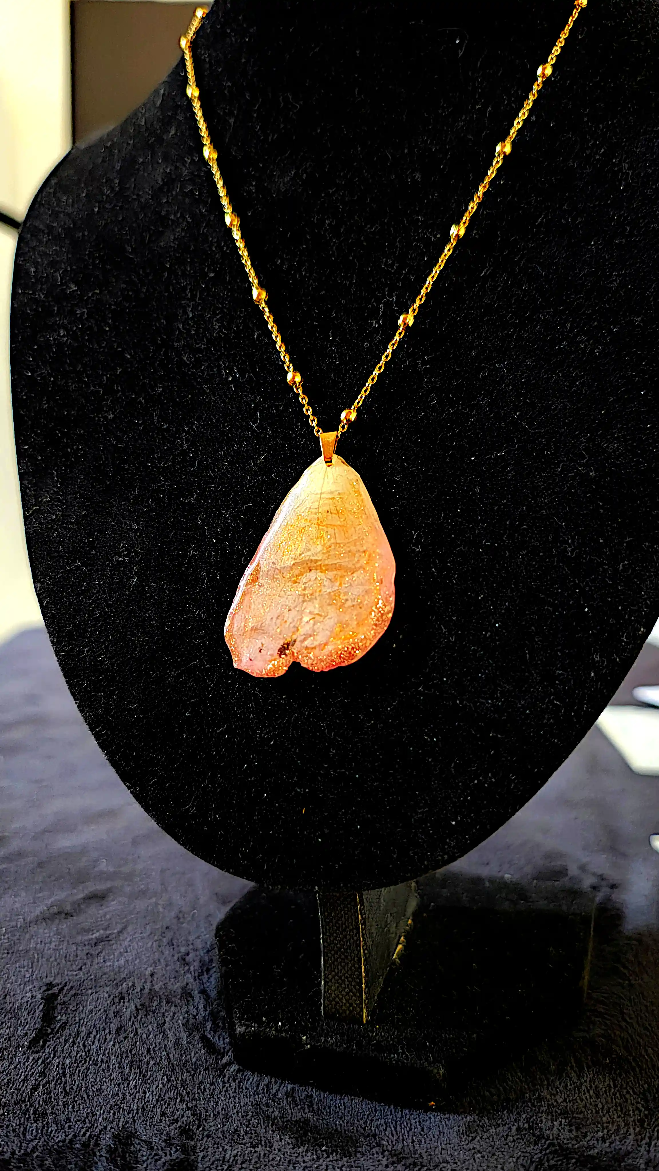 Pandantiv handmade din petală naturală de trandafir roz-auriu, protejată în rășină transparentă, finisat manual.
