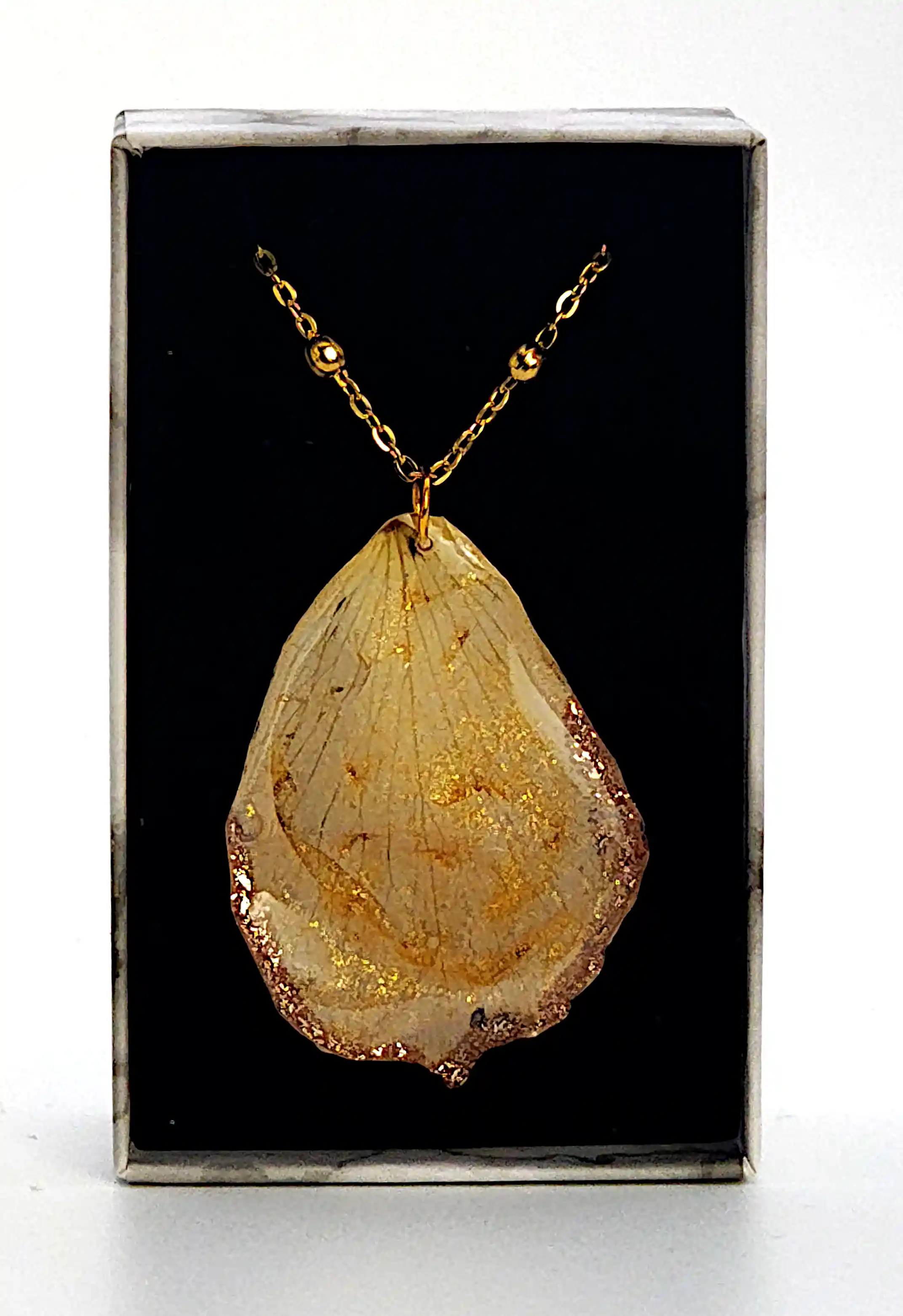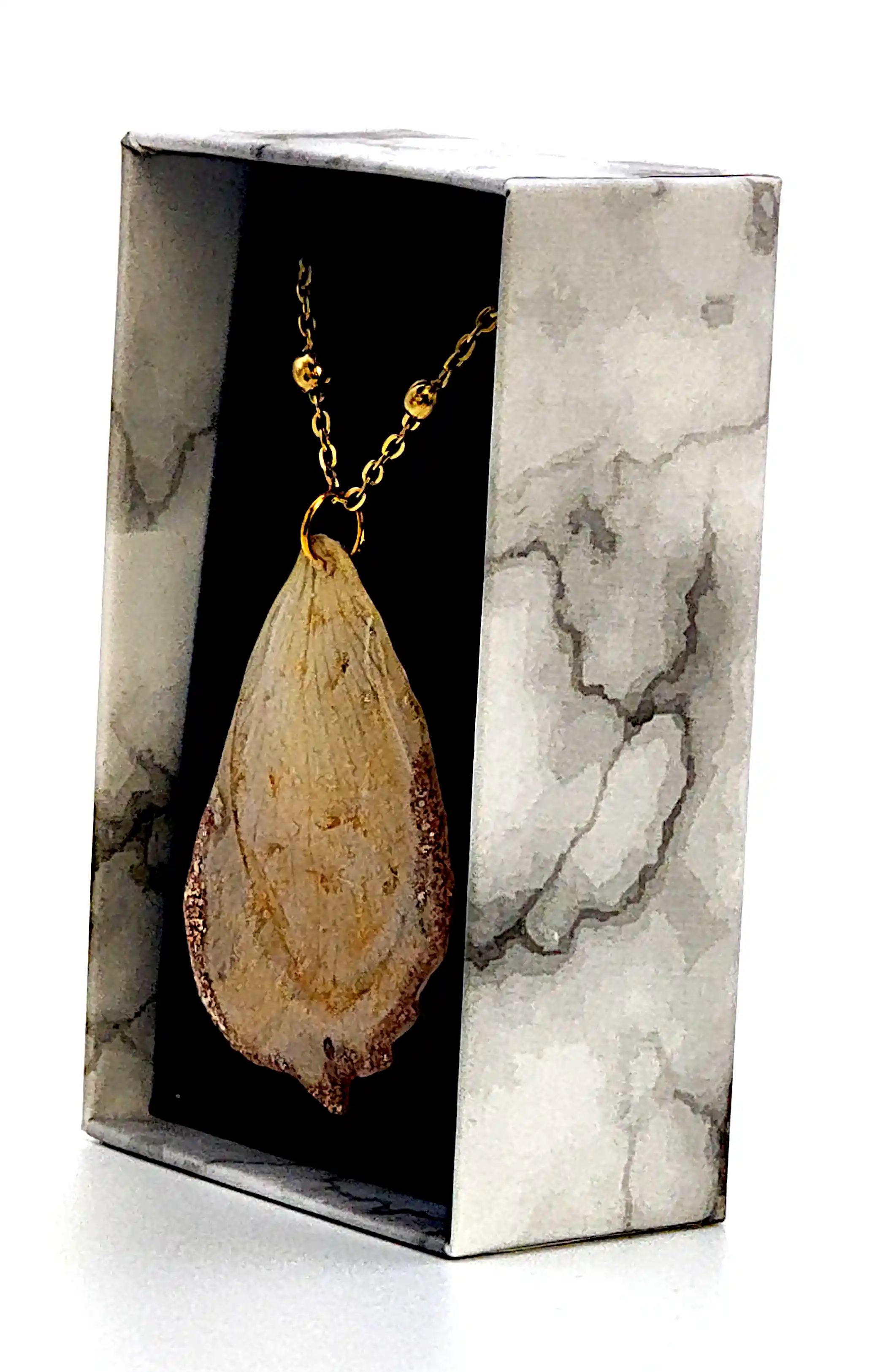 Petala păstrează textura sa naturală, cu nuanțe calde de portocaliu, roz pal și accente aurii, completată armonios de un lanț subțire din oțel inoxidabil placat auriu. Rezultatul este o bijuterie cu aspect natural și sofisticat, potrivită pentru femeile care iubesc eleganța discretă și autentică.