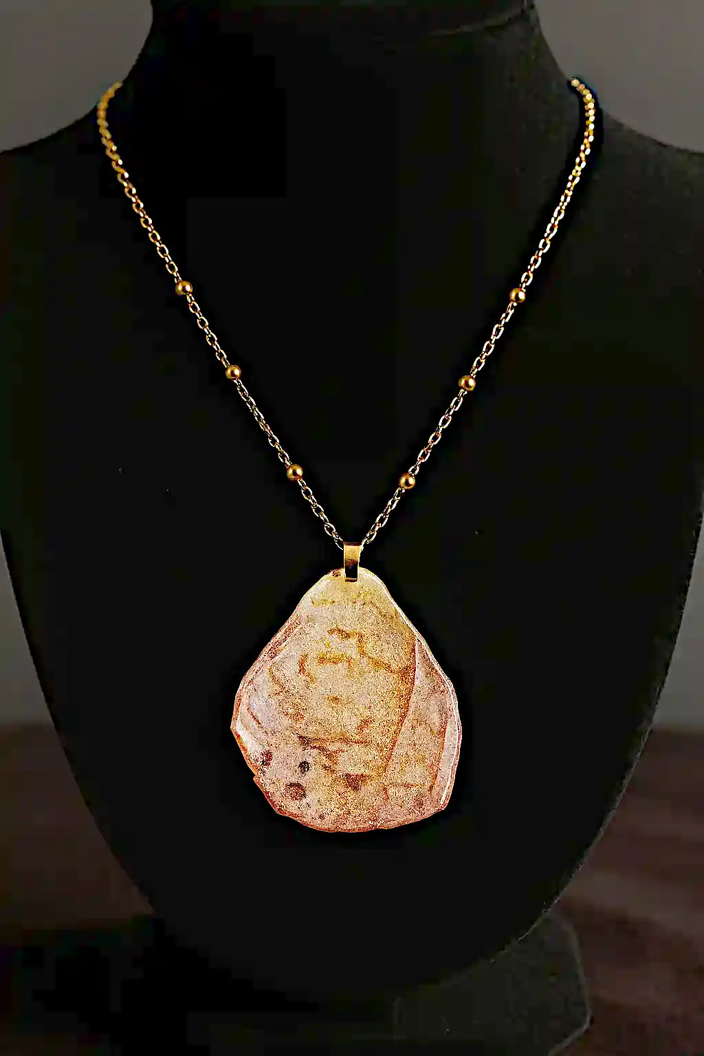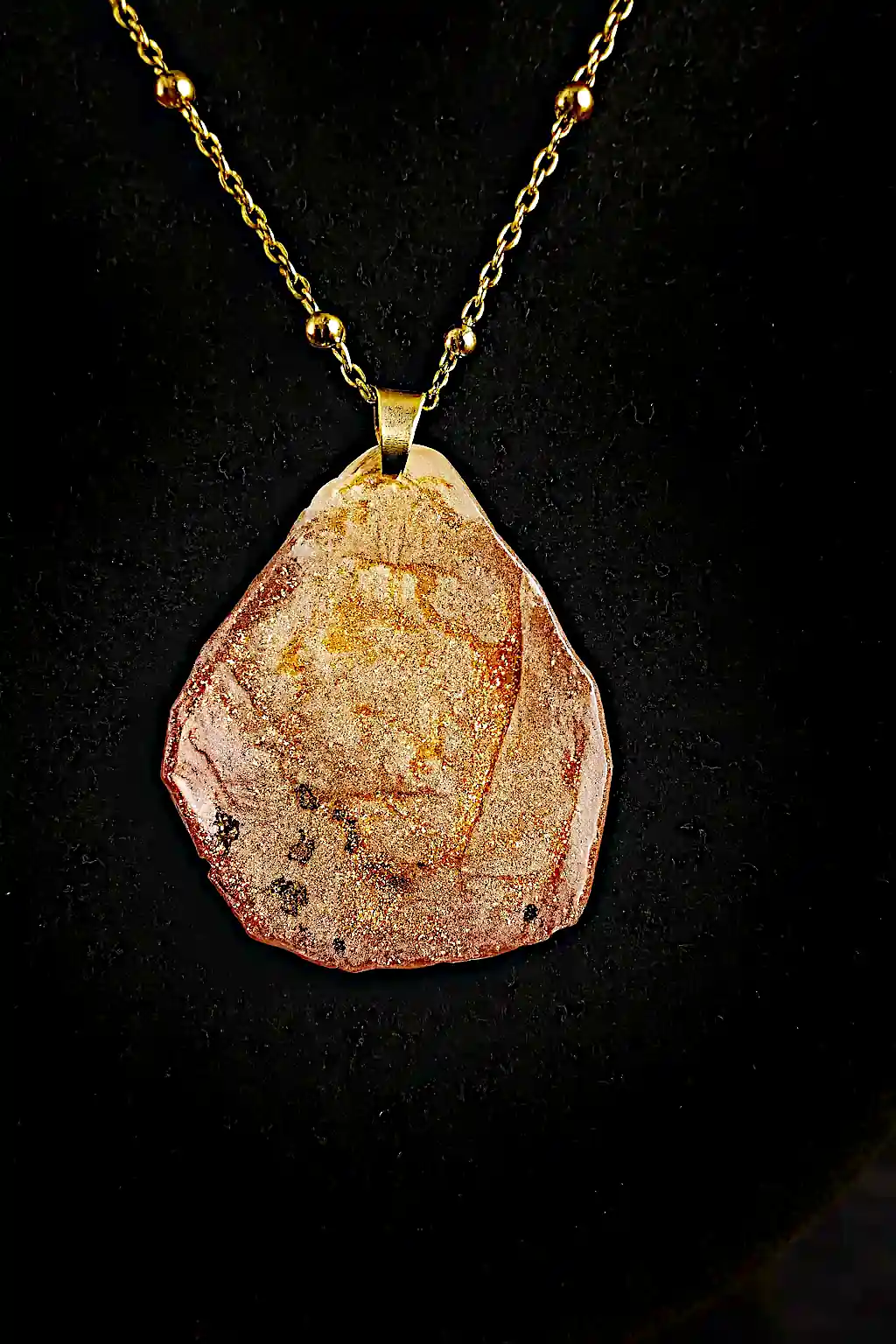 Petala, în nuanțe calde de auriu, bej și roșu subtil, este îmbogățită cu pigmenți metalici fini, care îi oferă o strălucire elegantă și naturală. Lanțul placat auriu completează perfect designul rafinat, transformând acest pandantiv într-o piesă atemporală, potrivită pentru ținute casual sau elegante.