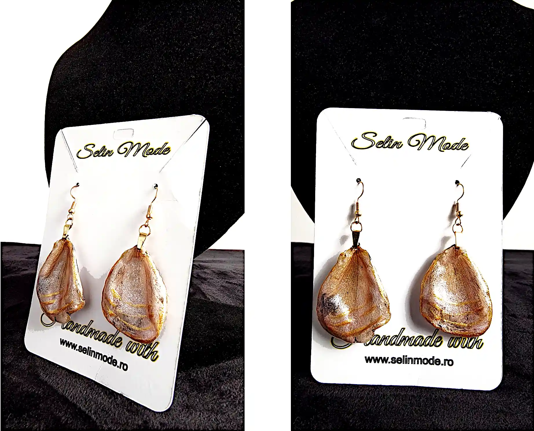 Designul este accentuat de reflexii aurii și sidefate aplicate manual, care oferă luminozitate și un efect sofisticat. Cerceii sunt montați pe sistem de prindere tip cârlig, iar pandantivul este suspendat pe un lanț metalic fin, de culoare aurie.