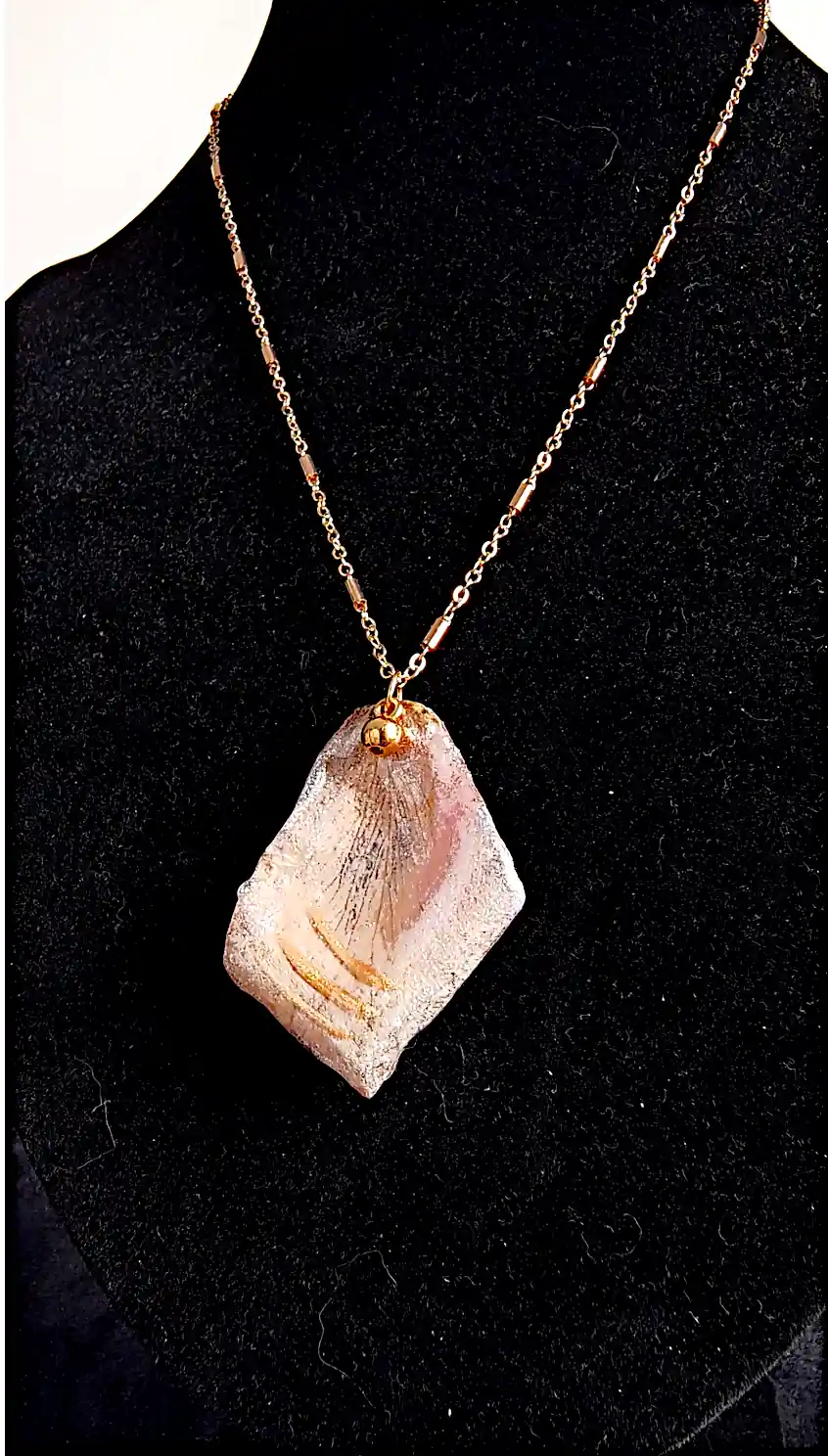 Set handmade elegant, cod SM 75, compus din cercei și pandantiv realizate din petale naturale de trandafir, fiecare petală fiind atent conservată în rășină epoxidică pentru a-i păstra frumusețea naturală și delicatețea culorii.