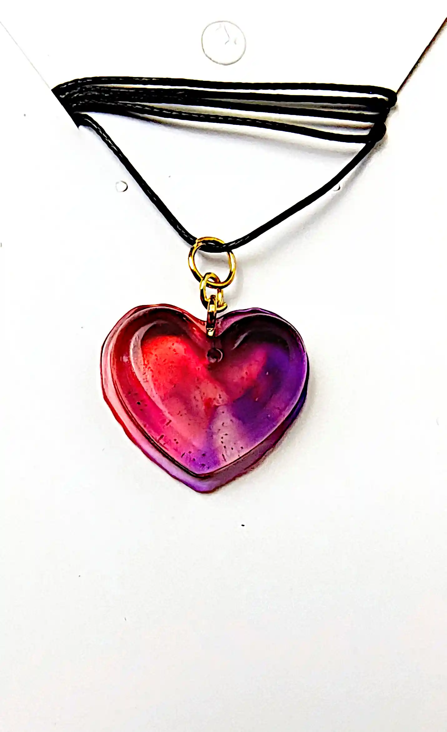 Pandantiv realizat manual din rășină epoxidică, turnat în formă de inimă, într-o combinație intensă de culori roșu și mov. Suprafața este lucioasă, netedă și transparentă, iar nuanțele sunt dispuse artistic, creând un efect vizual fluid. Accesoriile metalice sunt aurii, iar pandantivul este livrat împreună cu șnur negru, gata de purtat. Fiecare piesă este turnată manual, ceea ce înseamnă că modelul coloristic este unic și nu poate fi replicat identic. Recomandat pentru ținute casual, cadou sau purtare zilnică.