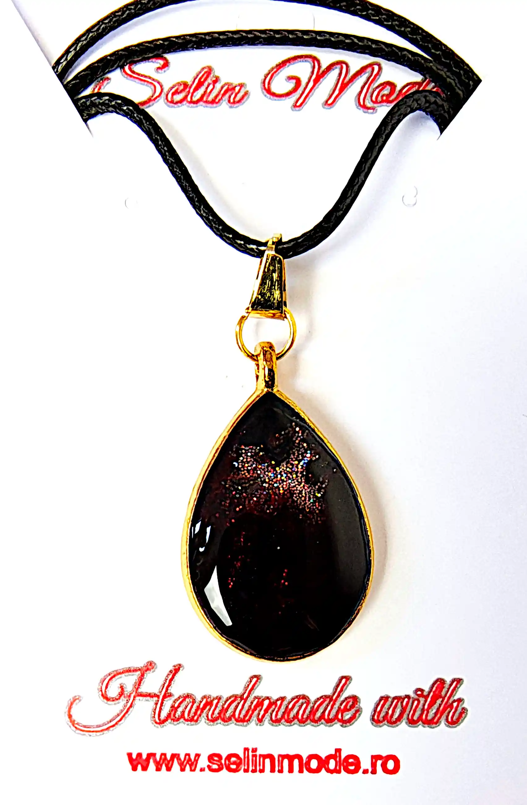 Pandantiv realizat manual din rășină epoxidică, model în formă de picătură, cu o nuanță închisă predominant negru și reflexii roșii fine, vizibile în lumină. Suprafața este lucioasă și uniformă, accentuând profunzimea culorilor. Marginea pandantivului este metalică aurie, oferind un contrast elegant. Produsul este livrat împreună cu șnur negru, gata de purtat. Fiind turnat manual, fiecare pandantiv este unicat, iar distribuția culorilor diferă ușor de la un produs la altul.