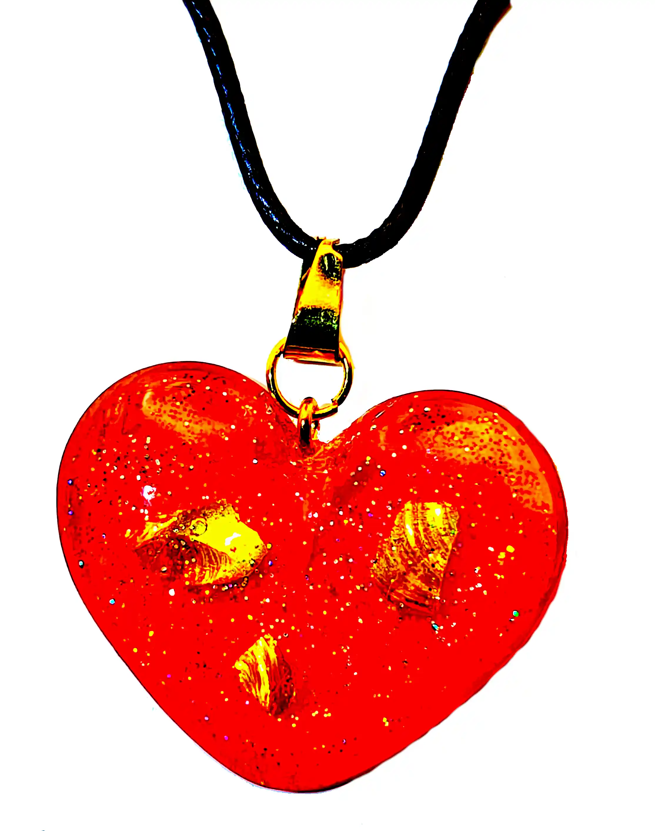 Pandantiv inimă din rășină roșie cu fulgi aurii și sclipici, prindere aurie și șnur negru. Model unicat SM 211, elegant și romantic.