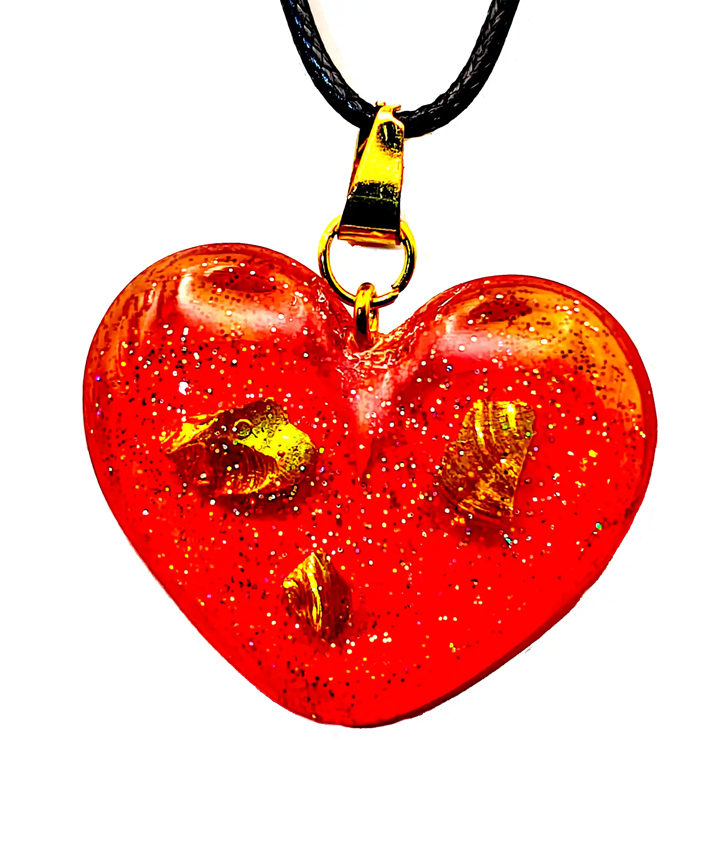 Selin Mode Pandantiv Handmade din Rășină – Inimă Roșie cu Fulgi Aurii și Sclipici Fin – Model Unicat SM 211