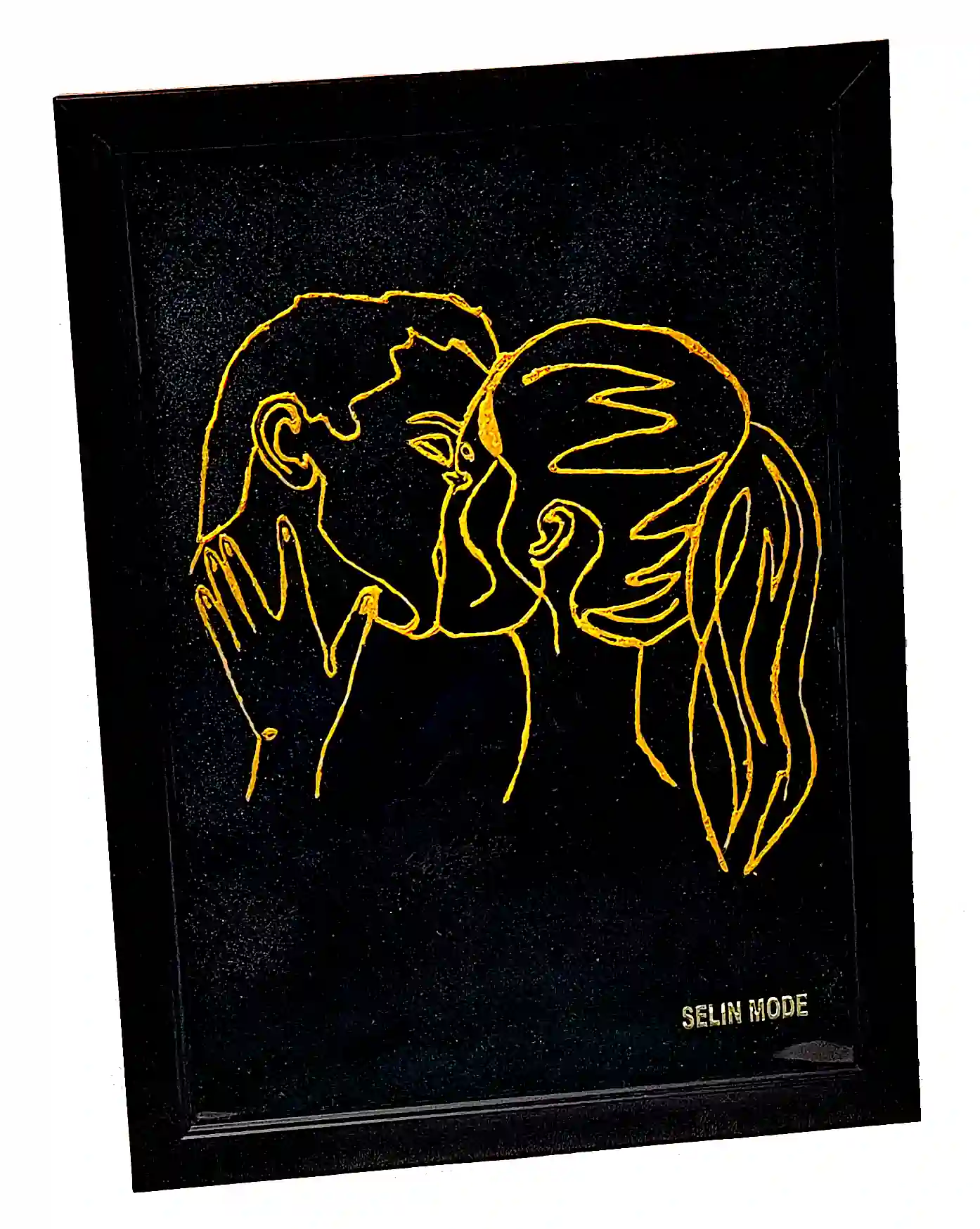 Adaugă un strop de romantism și rafinament în decorul casei tale cu acest tablou decorativ realizat manual. Designul minimalist, conturat în nuanțe aurii pe un fundal negru elegant, surprinde perfect emoția unui sărut pasional, simbolizând iubirea eternă.